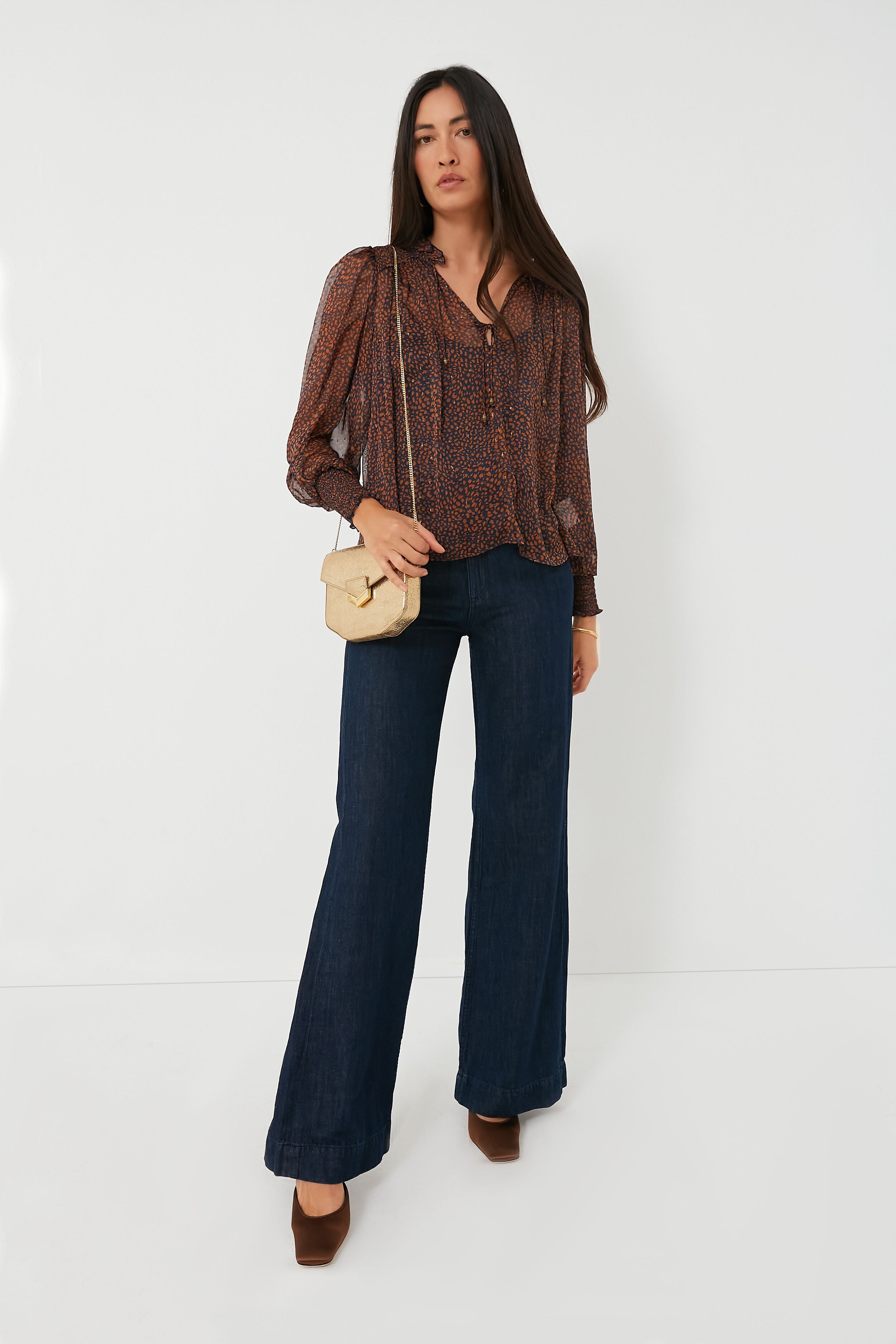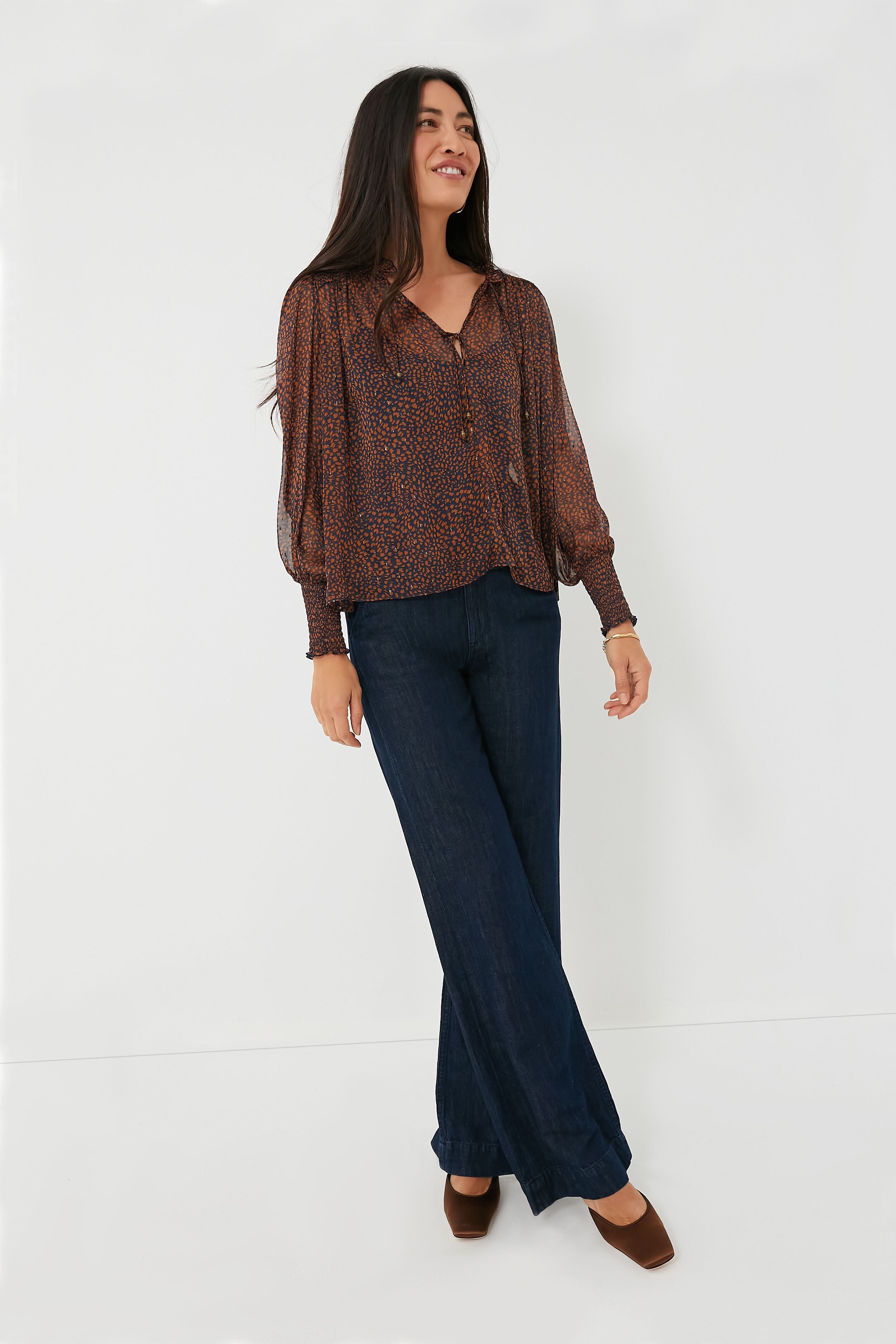 A standout style. we can't get enough of the Navy Brown Floral Prado Top. We love when a silhouette is so versatile that we can dress it up or down endlessly for a variety of occasions. and this blouse does it effortlessly — wear it with dark denim and boots for a casual-cool look to attend an event at the kids' school. or wear it with a mini skirt and heels for a dinner party or girls' night out. The ruffled collar. self-tie neckline. and slightly sheer blousy vibe make this a true must-have. so go ahead and hit add to bag (we know you want to).