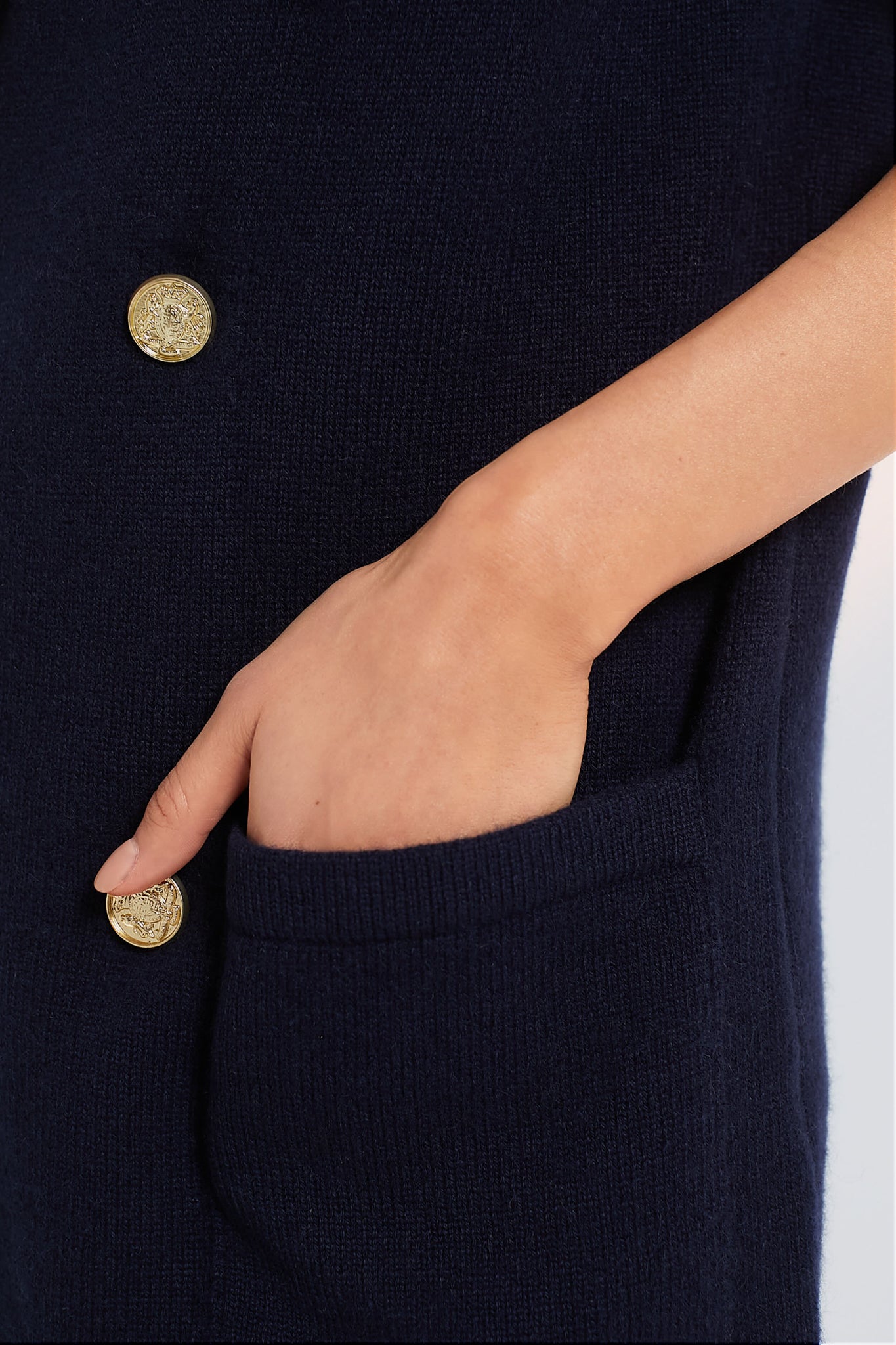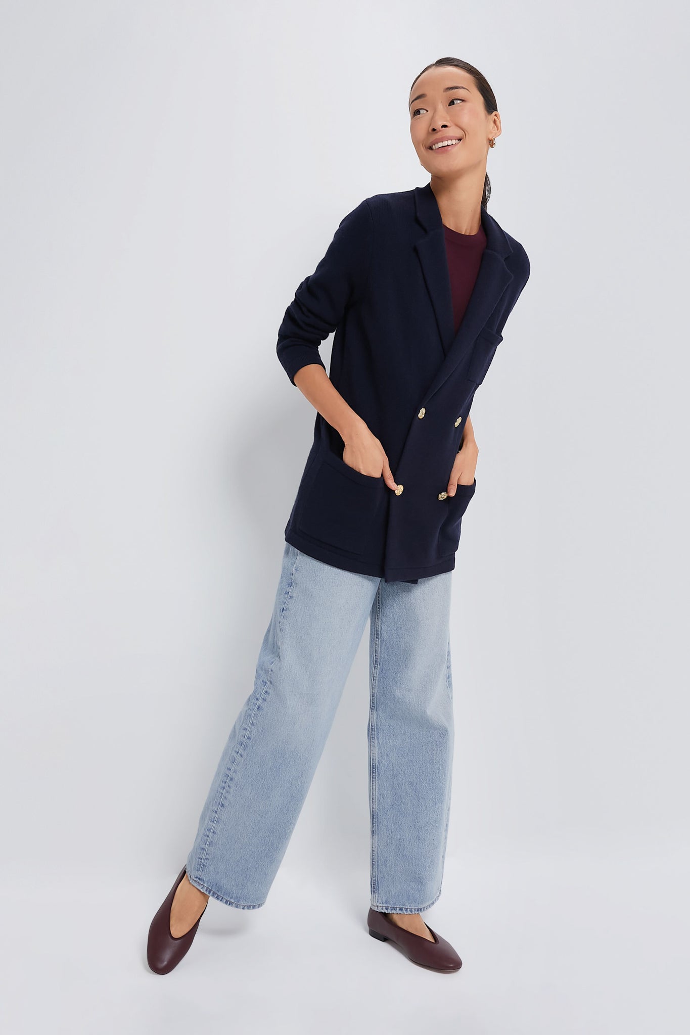 Crafted from the finest cashmere. this Navy Cashmere Benji Blazer combines timeless elegance with luxurious comfort. The tailored fit. sharp lapels. gold-tone buttons exudes sophistication. where as a relaxed silhouette provides comfort yet polished. put-together look. Pair unbuttoned with a tank and denim or with a floral maxi skirt and ballet flats for a season-less look!