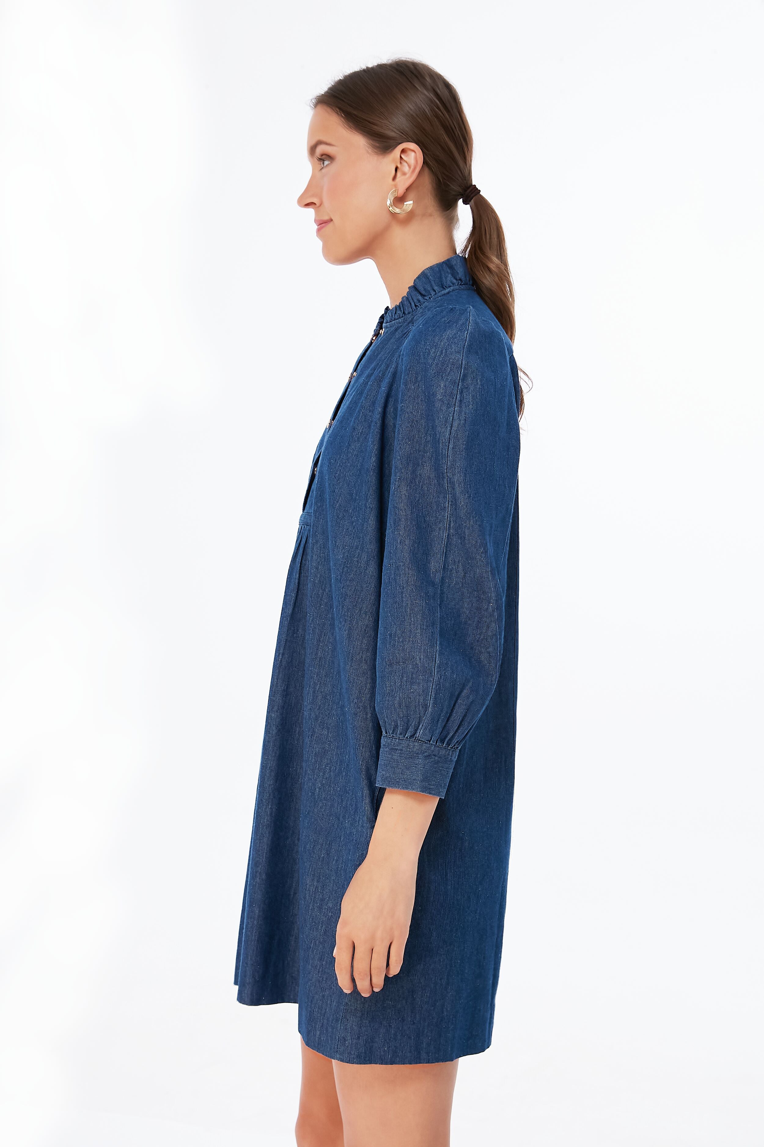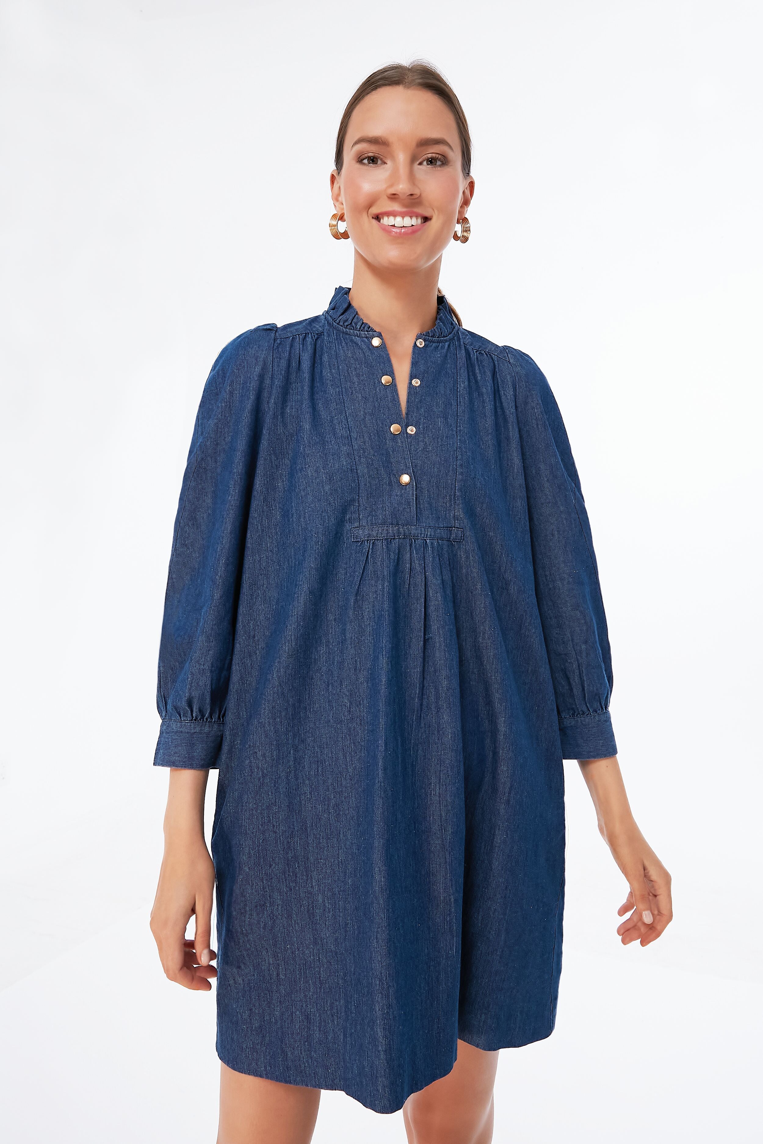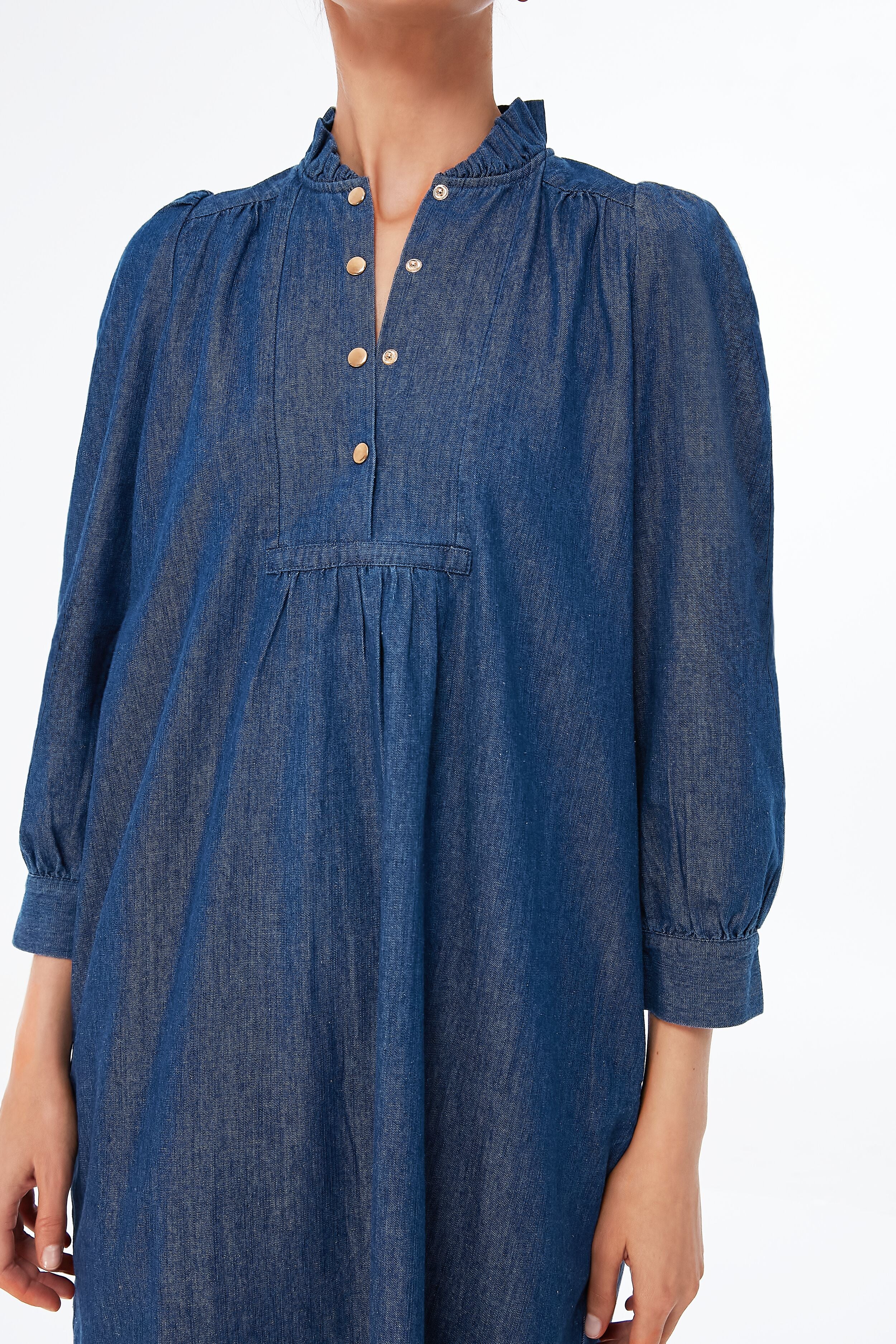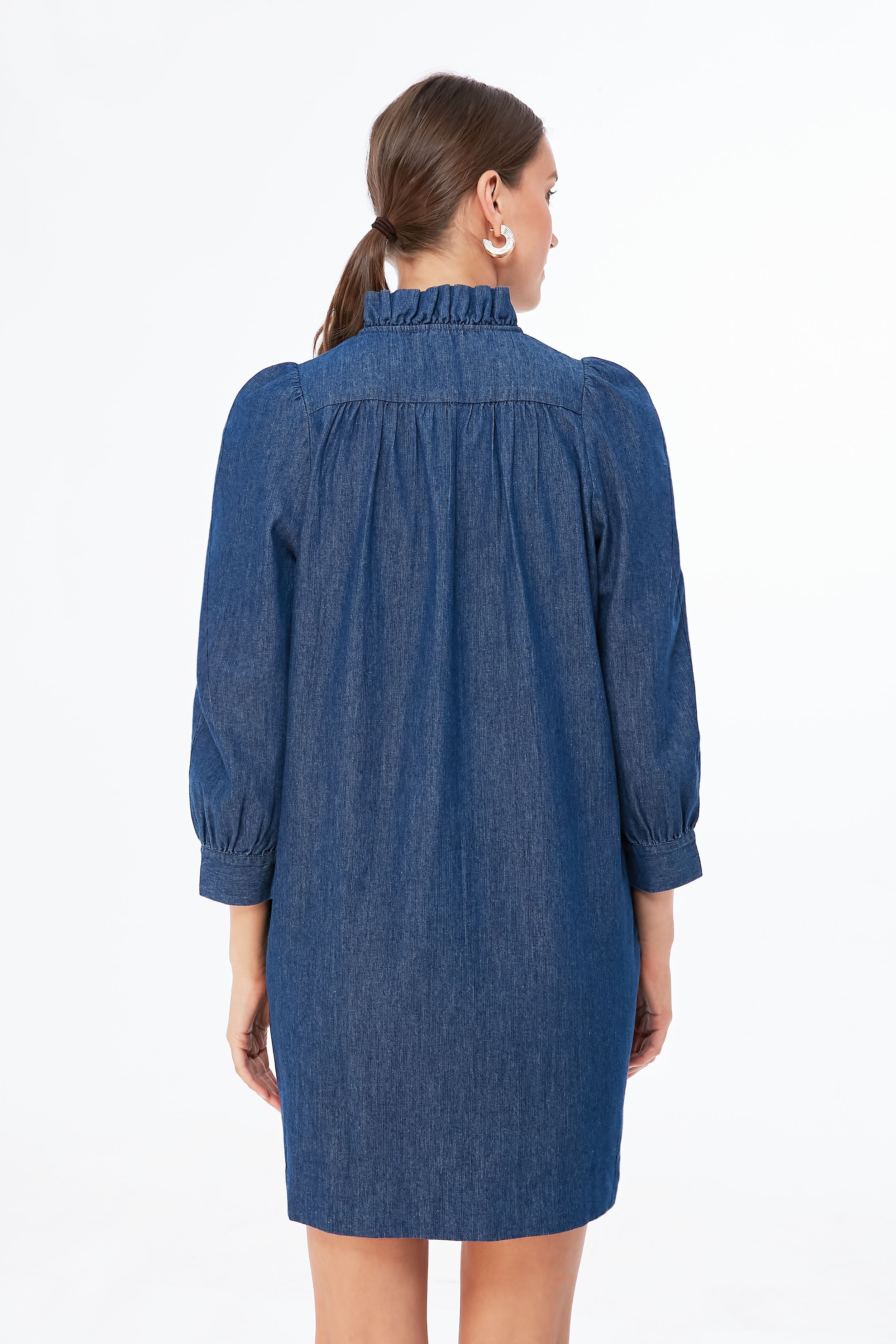 Featuring a button down bib. puff sleeves. and a shift silhouette. the Claiborne Dress is perfect for everything from meetings to cocktails. In a fun updated navy chambray colorway. we are pairing this style staple with sneakers or boots for easy. chic looks!