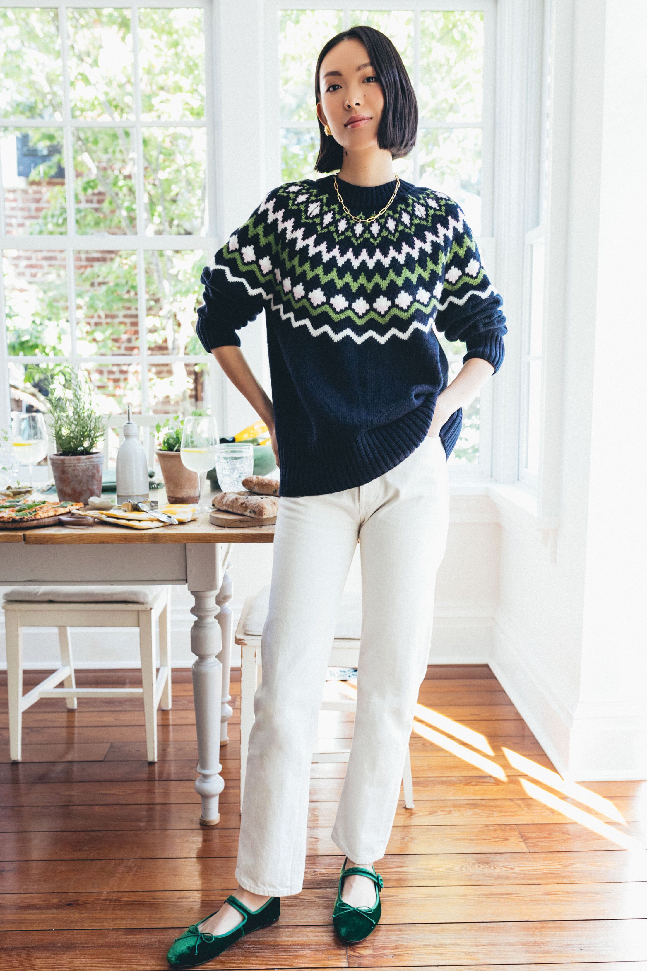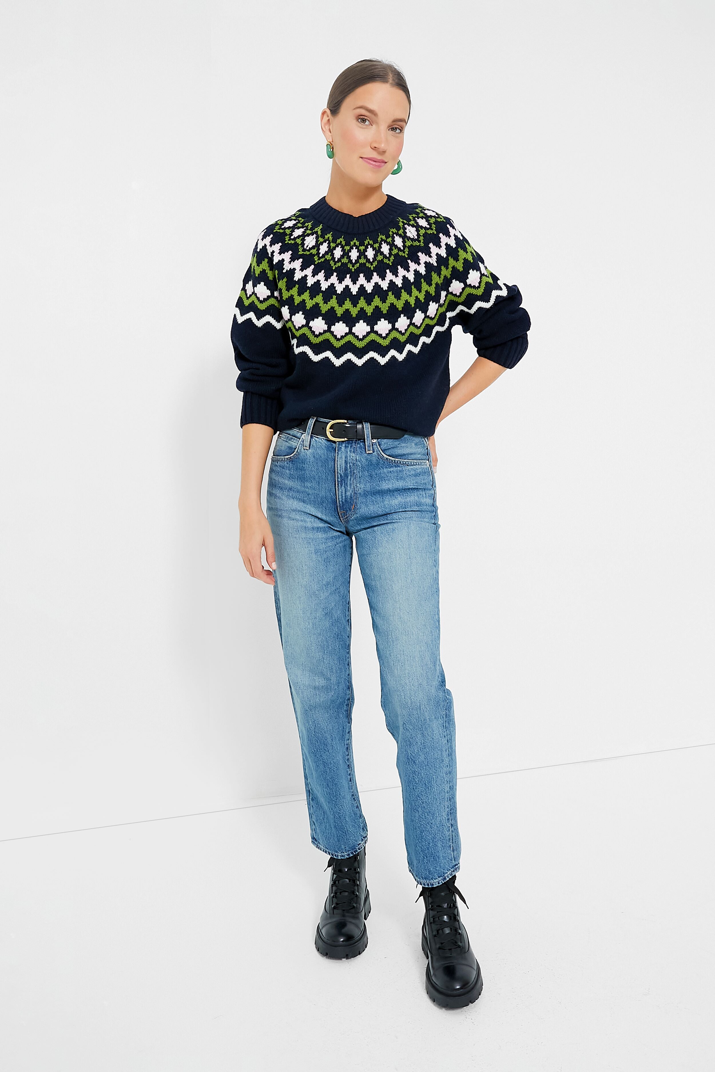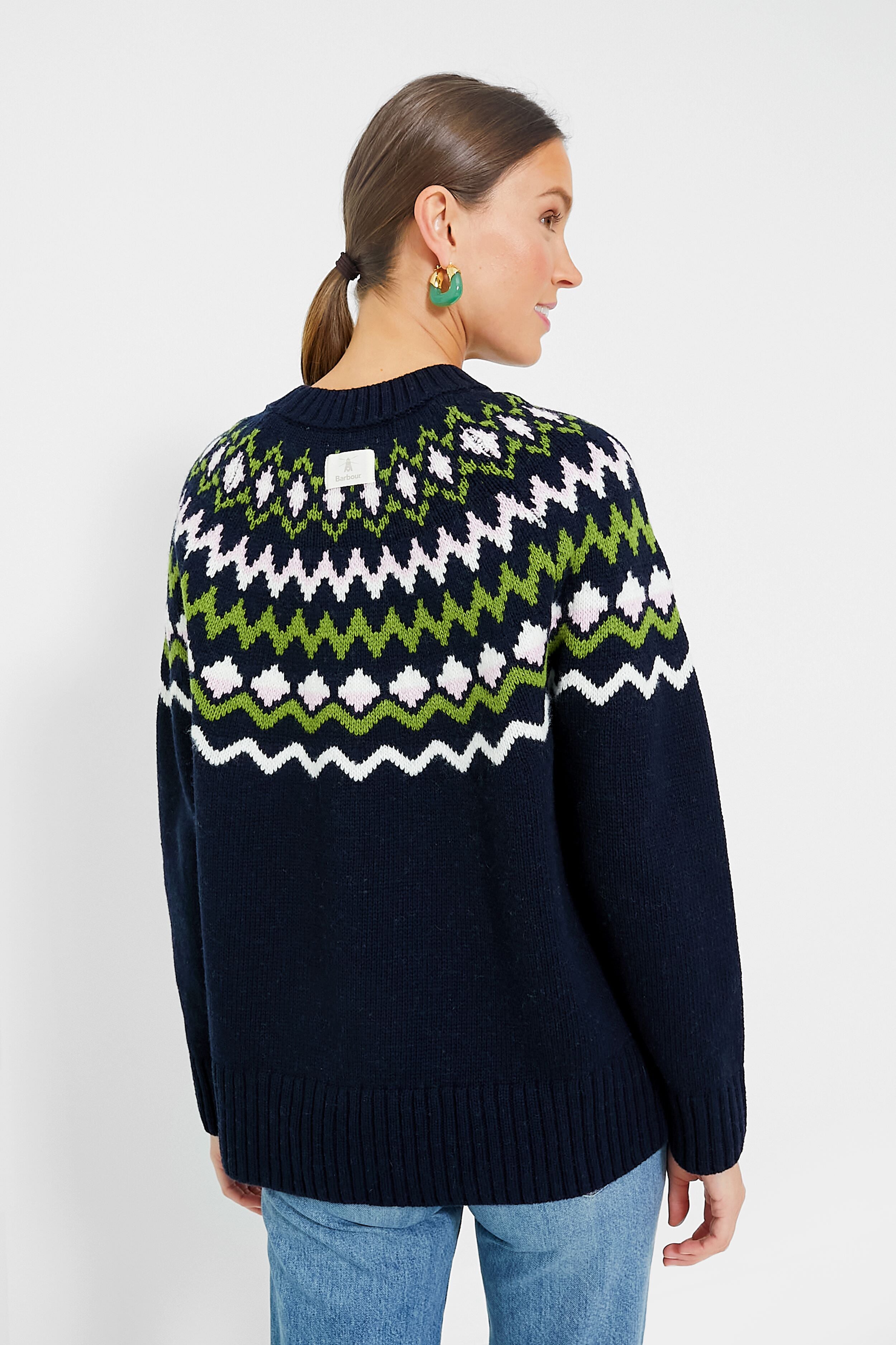 A fresh take on Fair Isle. the Chesil Knit is keeping us cozy this season. With a chic crewneck. long sleeves with ribbed cuffs. and a slightly relaxed fit perfect for layering or tucking in. this classic navy sweater is exactly what you need for sitting by the fire. sipping a hot toddy. or braving the cold. Pair with a midi skirt and tall boots to dress it up. or keep it classic with denim and gold hoops for everyday wear.