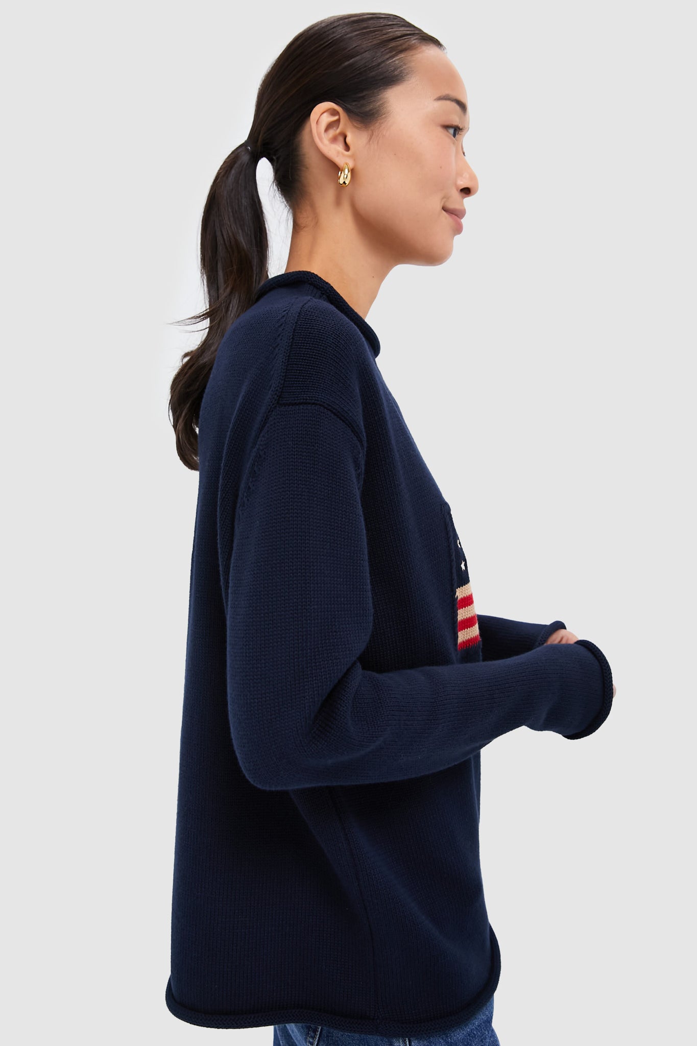 A closet essential. the Americana Sweater evokes a nostalgic feeling while featuring modern design details for a classic and chic look. This seasonless. 100% cotton pullover will take you from backyard BBQs to cozying up by the fire with its easy rolled hem and intarsia flag front and center.