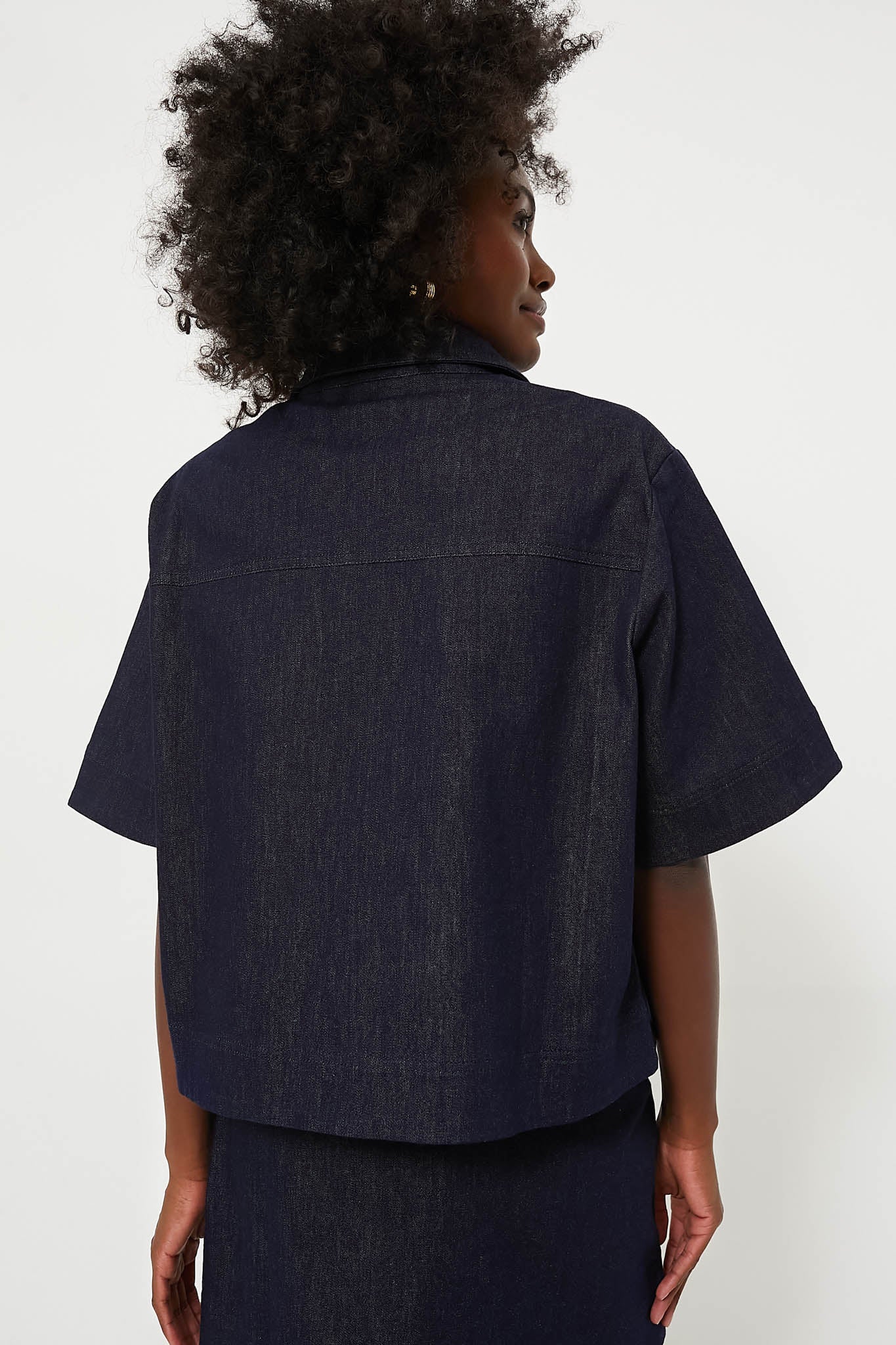 The perfect blend of elevated and casual. we are loving the Navy Denim Tessa Top for the transition months. With a boxy. cropped fit. covered front buttons. and front flap pockets. this adorable style will go with anything in your closet. Pair with colorful pants and heels for dinner dates. or with the matching Navy Denim Taryn Mini Skirt and ballet flats for a chic set.