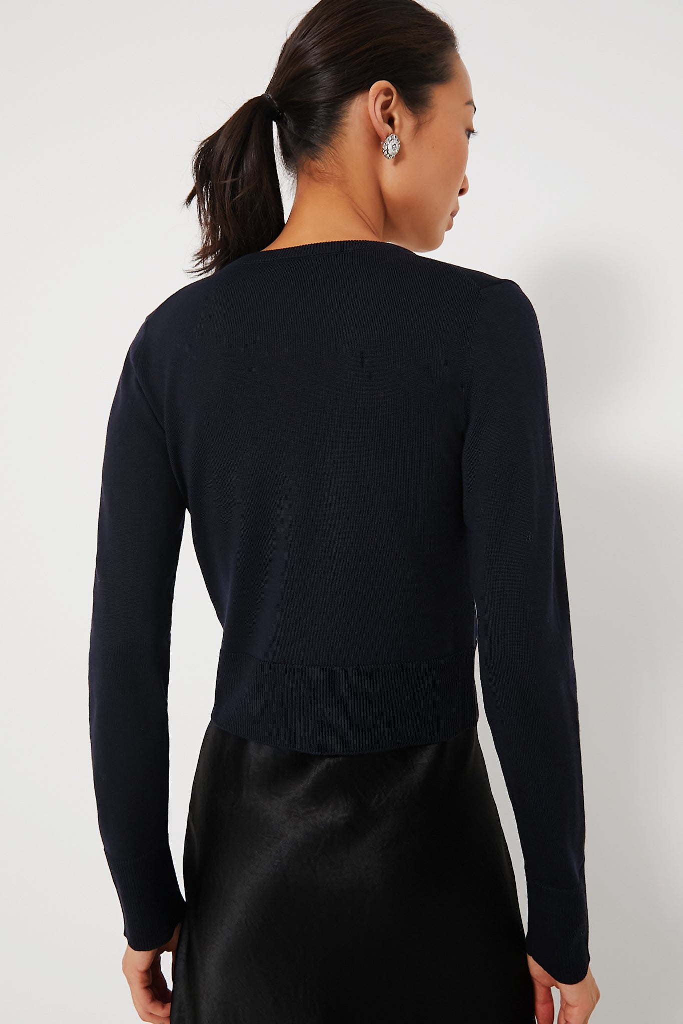 The Navy Drape Detail Cardigan is knit from a lightweight merino wool that makes it perfect for year-round wear. Shaped for a close fit. its classic silhouette is enhanced by feminine draping and embellishments at the collar. We are styling this with an LBD and heels for cool-weather date nights. or with straight leg denim and loafers for a chic daytime look.