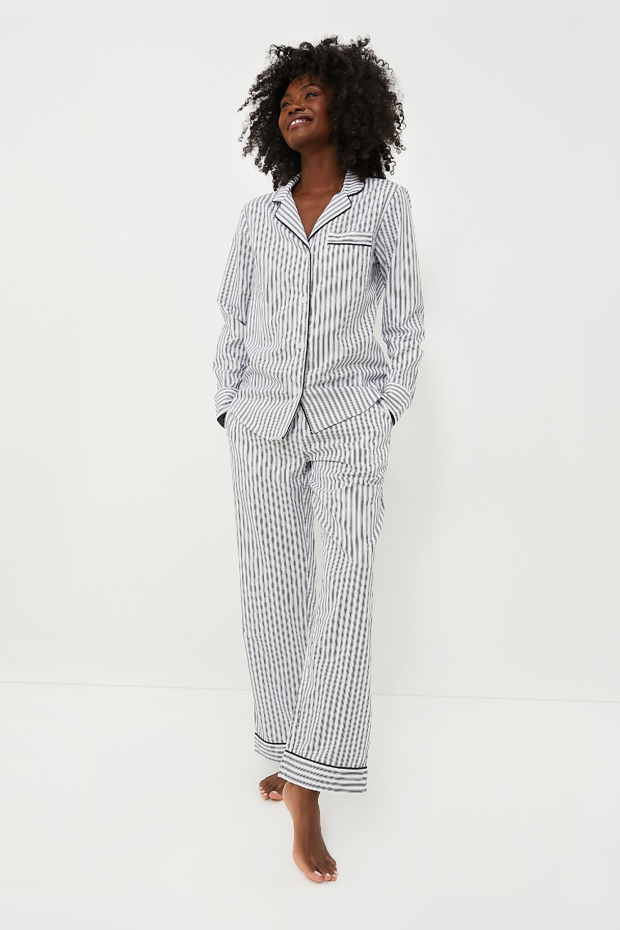 The Navy French Ticking Pajama Set is made from the finest quality cotton in a classic print. Yarn-dyed to prevent fading and brushed for added softness. we love how these get cozier with every wash. Add slippers and a robe for relaxing mornings spent with a cup of coffee in hand!