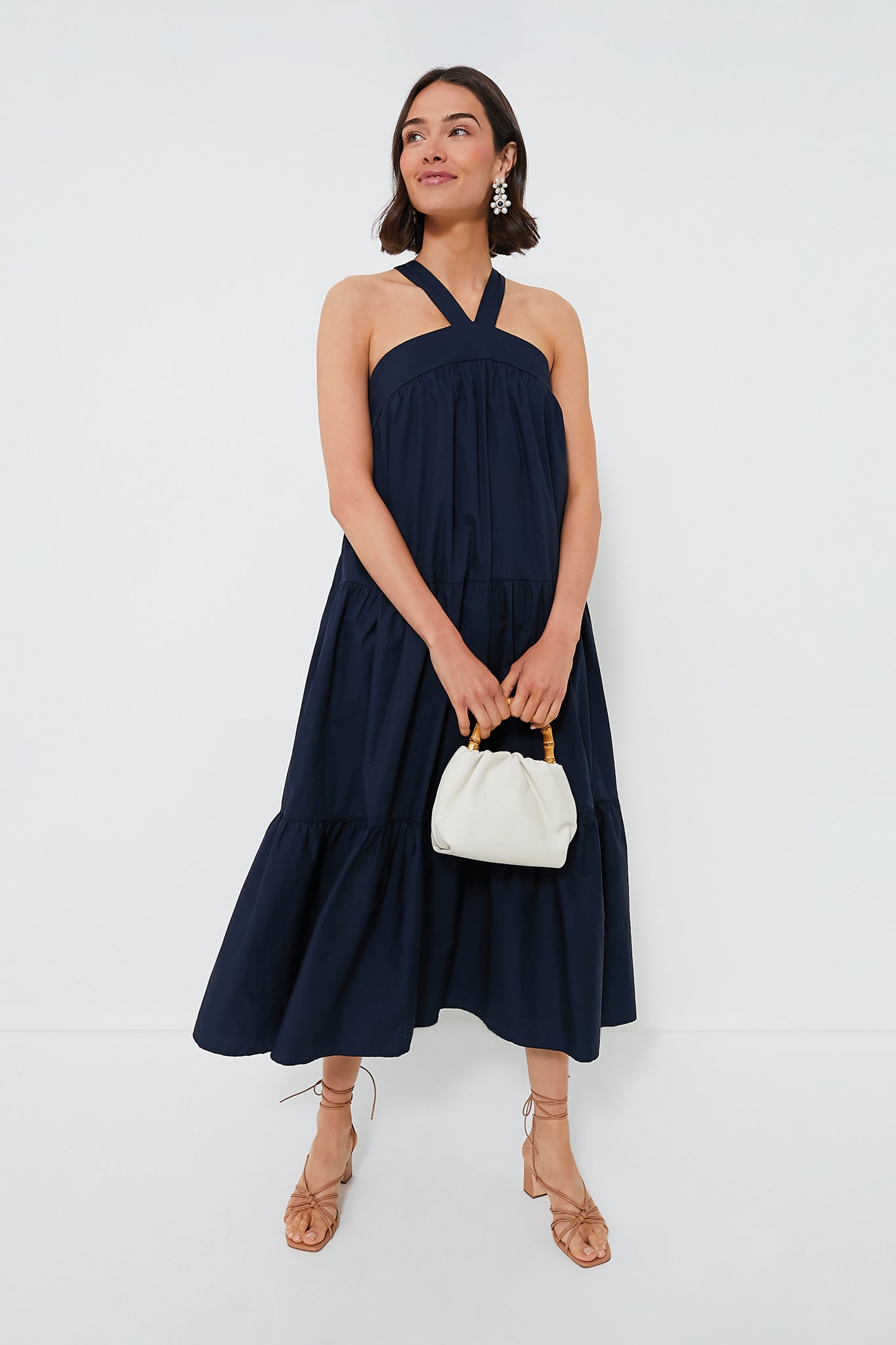 The Navy Irene Dress is effortless and oh-so-elegant. This maxi boasts a halter neckline. criss-crossed straps. and a full tiered body that will move with you every step you take. Opt for a casual look with simple sandals and a tote. or dress up with heels and accessories.