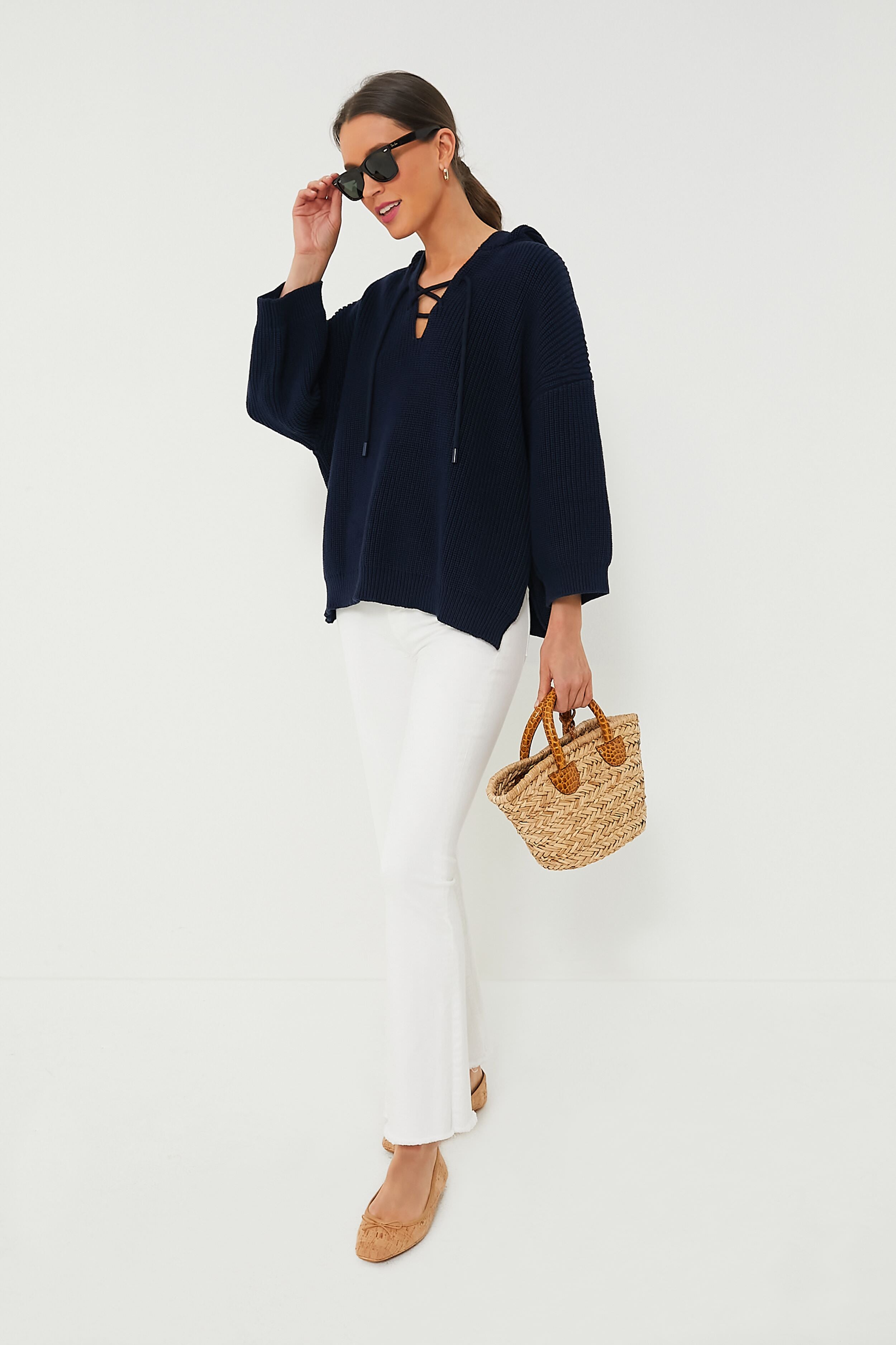 An ideal style for running errands. grabbing lunch with friends. or shopping around town. the Navy Knit Declan Pullover is effortless and oh-so-classic. This slightly boxy top boasts quarter-length sleeves. a front lace-up tie closure. and a curved hem. this stunner checks all the boxes. Pair with denim shorts and sneakers or layer it over a striped-tee and your favorite tee for a playful yet chic everyday look.