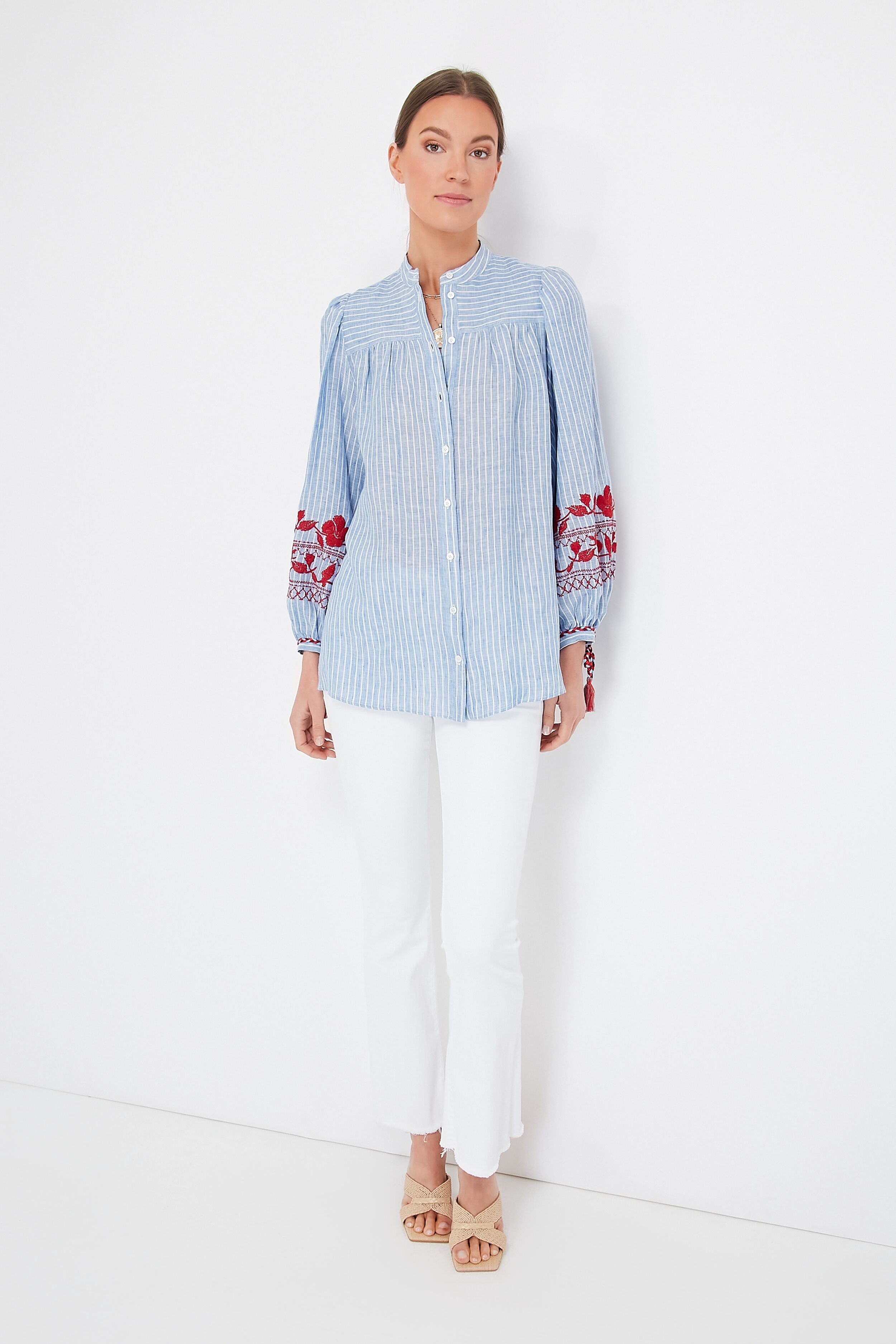 Talk about a statement top! The Navy Legno Blouse makes a real splash with its standout sleeves — a balloon shape. contrasting floral embroidery. and tassel ties all bring the flair. Bohemian-inspired details like a mandarin collar and a relaxed fit take a pinstriped button down to new heights. so we know you'll be excited about this stunning silhouette. Pair with white denim and sandals for a lowkey yet lovely look. or with a flowing maxi skirt and a raffia clutch to lean into beachy boho.