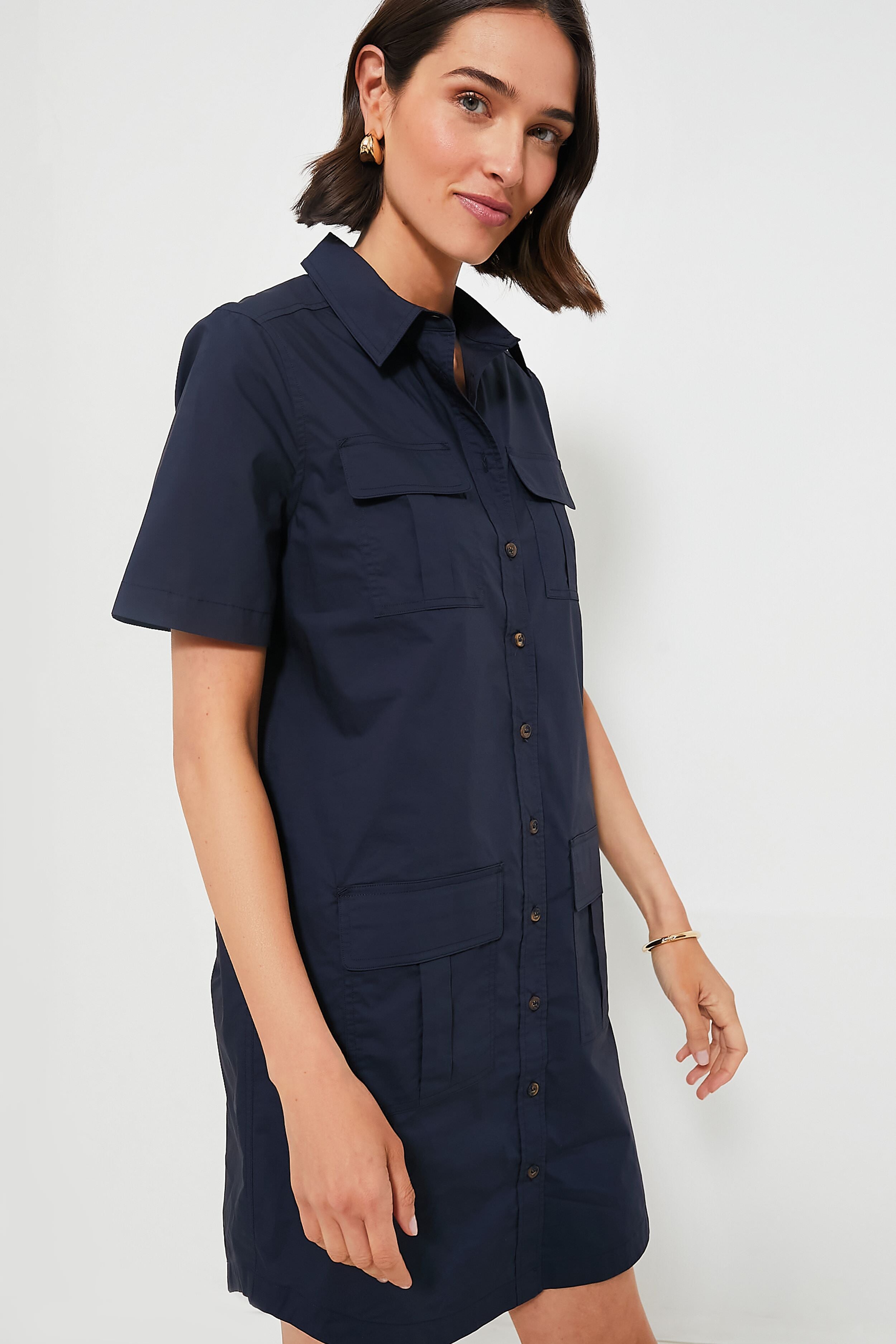 Elevate your capsule wardrobe with the Navy Nala Dress. This button down mini is constructed from a very light poplin perfect for warm summer days with functional chest and hip pockets offering casual yet polished look. Finished with mother of pearl buttons. we are pairing this number with everything from sneakers to sandals.