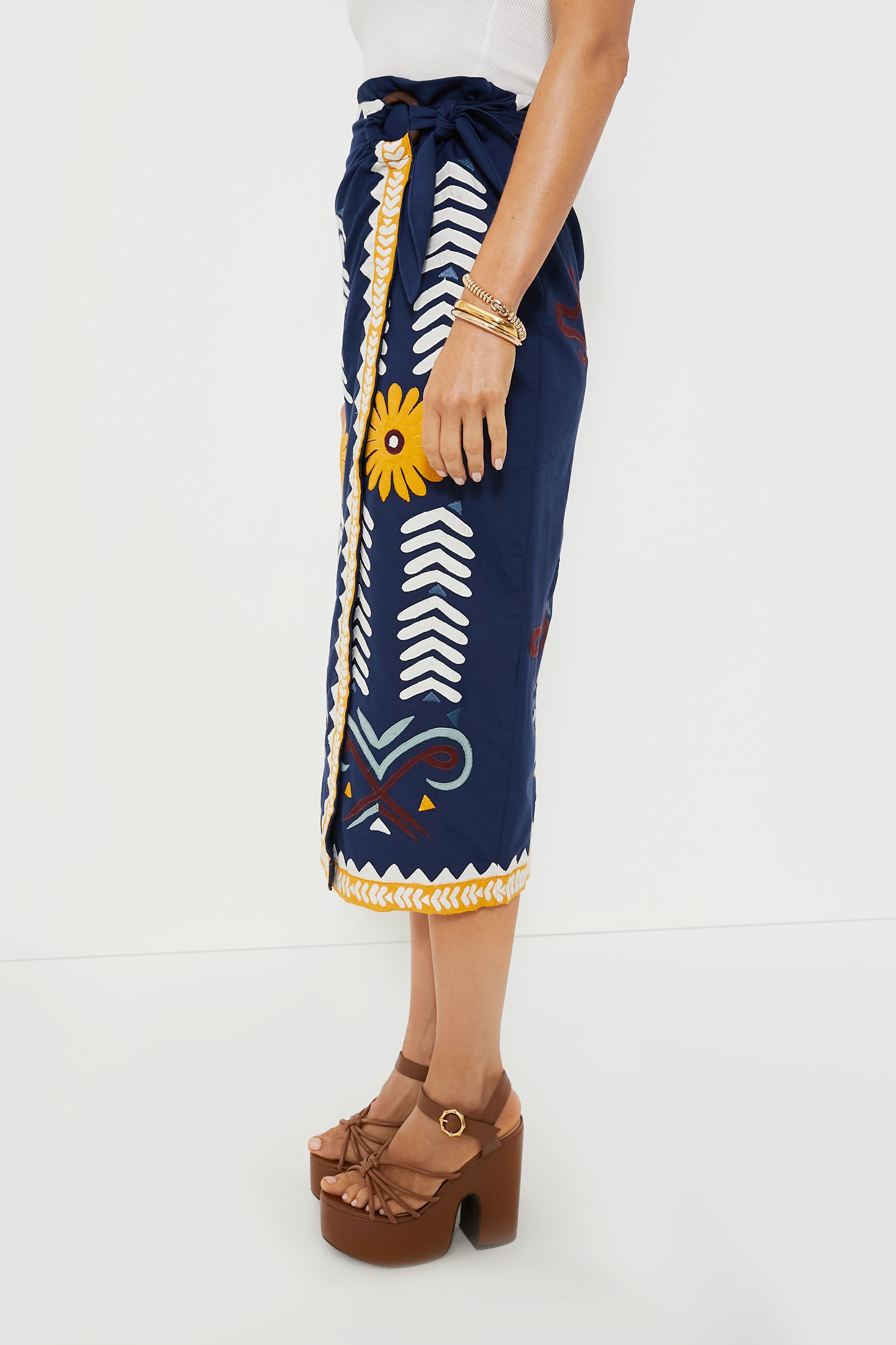 Taking styling tips from the classic sarong style. the Peony Loren Wrap Skirt is beautifully adorned with applique detailing. Featuring a high rise. a self-tie side detail. and a striking blue hue. this midi is the perfect way to spice up any outfit. Lightweight and breathable. it's made of breezy cotton for sunny days — so pair it with a tank. sandals. and sunnies for boozy brunches. or dress it up with a crisp blouse. wedges. and gold jewelry for dinners al fresco.