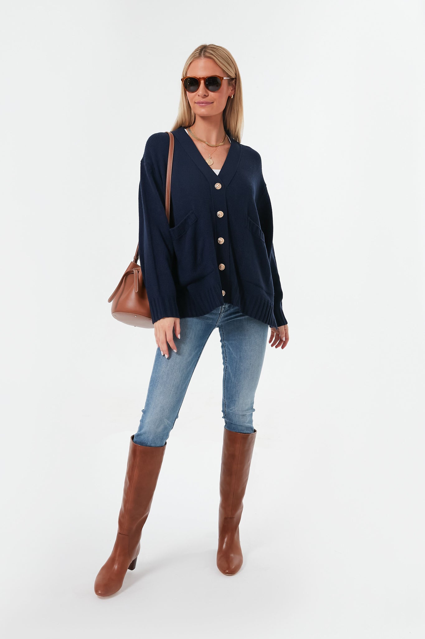 The perfect cardigan for all your fall and winter wardrobe needs- wear it on its own. over a dress or turtleneck. under a down coat. the possibilities are endless. Playful and versatile. the Navy Slone Cardigan features a V-neckline. front placket with gold buttons. and two front pockets for a classic. neutral look. From apple orchards to school pickup. this easy number will make you feel city-chic. just add flats and a bold bag for that effortless. cool girl look.