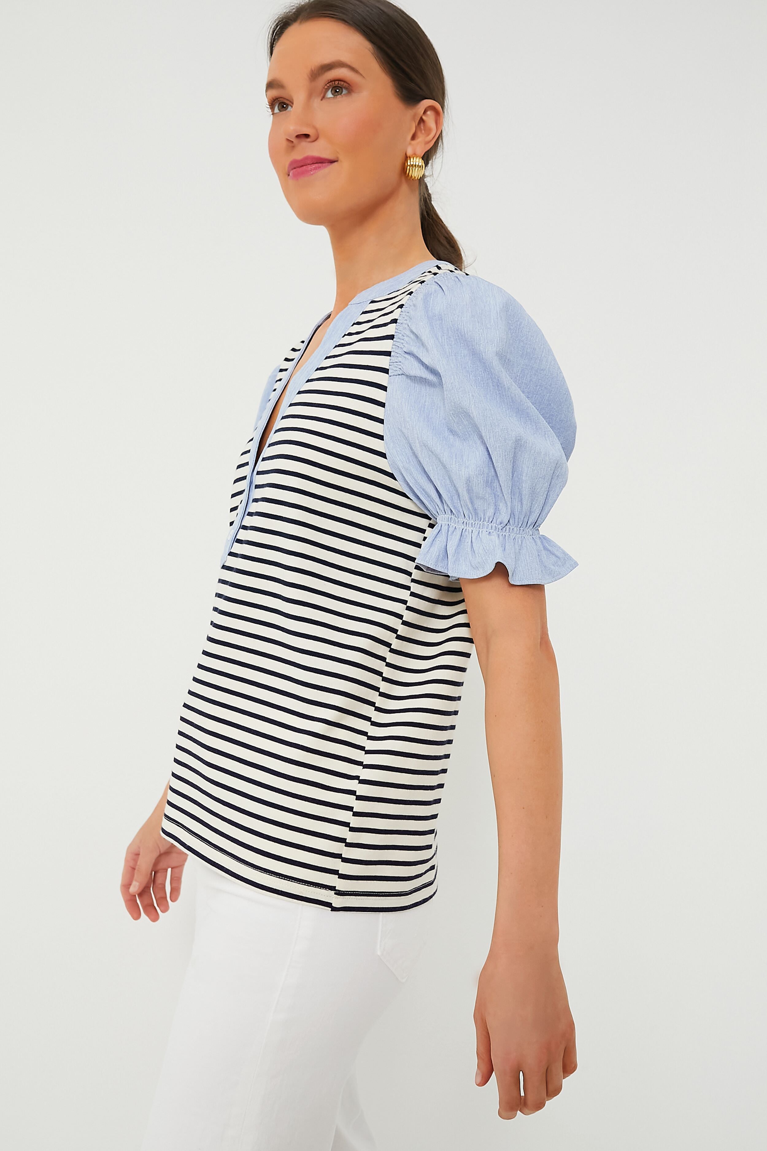 Texture play. feminine details. elevated yet playful - the Navy Stripe Livia Puff Sleeve is at the top of our list for multitasking tops. Easy to dress up or down. style it tucked in or left out. this blouse is versatile and seasonless. not to mention goes with anything. The ribbed body is contrasted by the on-trend puff sleeves that add fun and intrigue. Wear this tee with denim. mini skirts. leggings– all it's missing is your personalized style finishes.