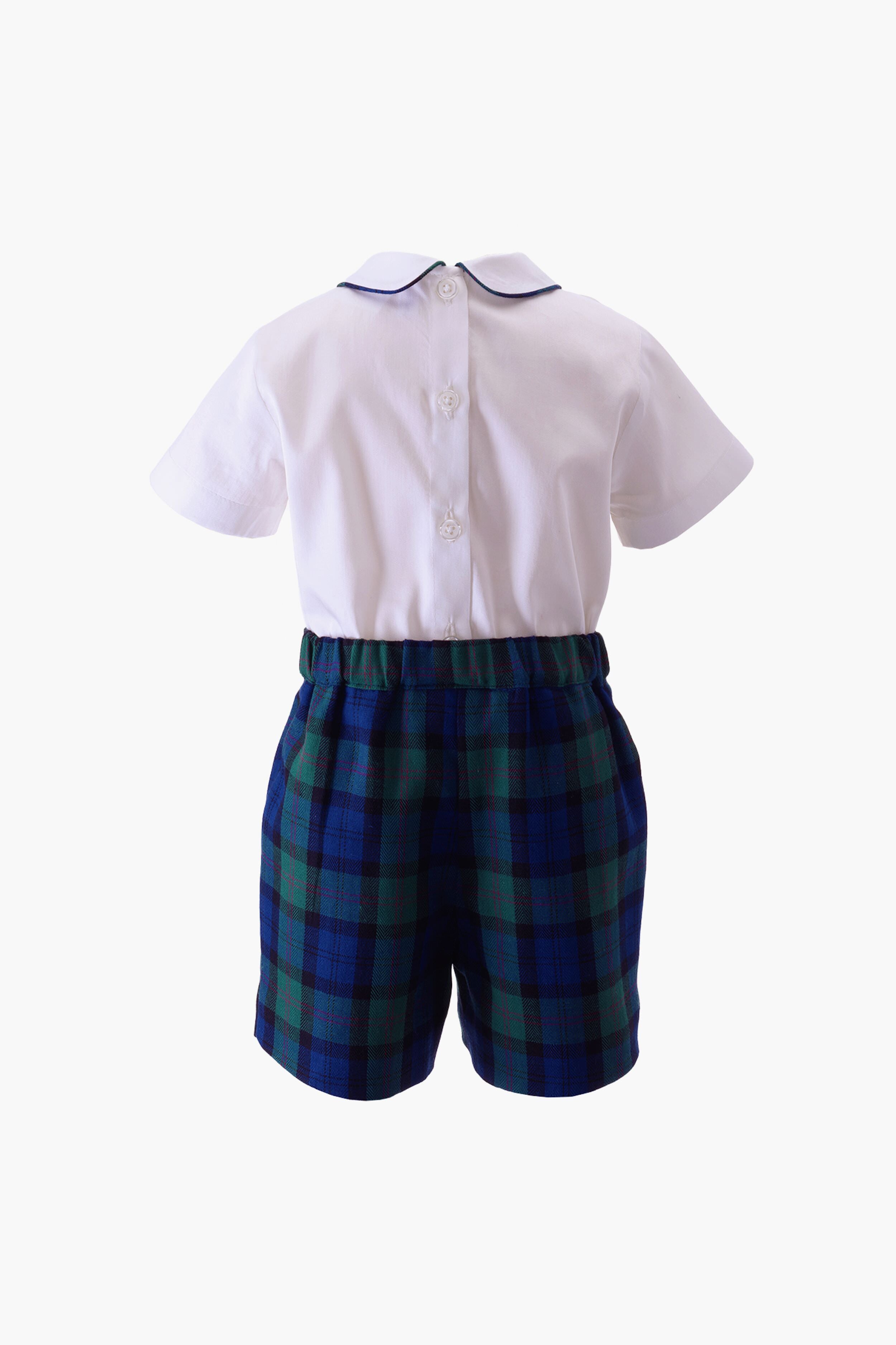 The Navy Tartan Shirt and Shorts Set is a classic formal outfit for your young gentleman's holiday wardrobe. Crafted from organic cotton. it features an ivory peter pan collar top with coordinating trim and flannel shorts with an elasticated back for comfort fit and a flat front. Perfect for special occasions. family photos or a holiday celebration. your little one is sure to look spiffy and polished.