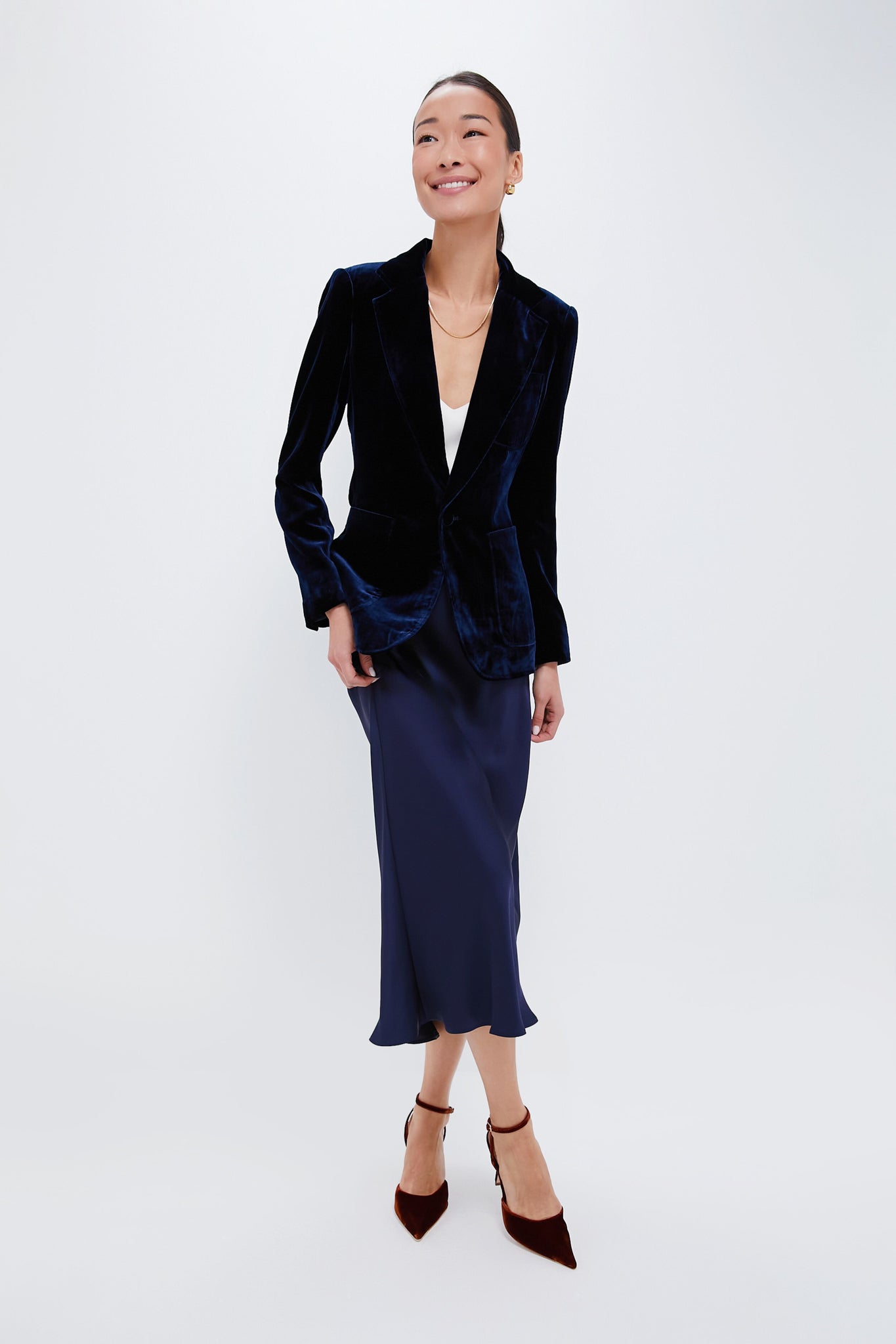 Expertly tailored for a slim fit. the Navy Velvet Blazer drapes beautifully on the body and is finished with with shoulder pads and back princess seams for a polished finish. Style it with denim and heels for evening. or over a dress to shake up your look.