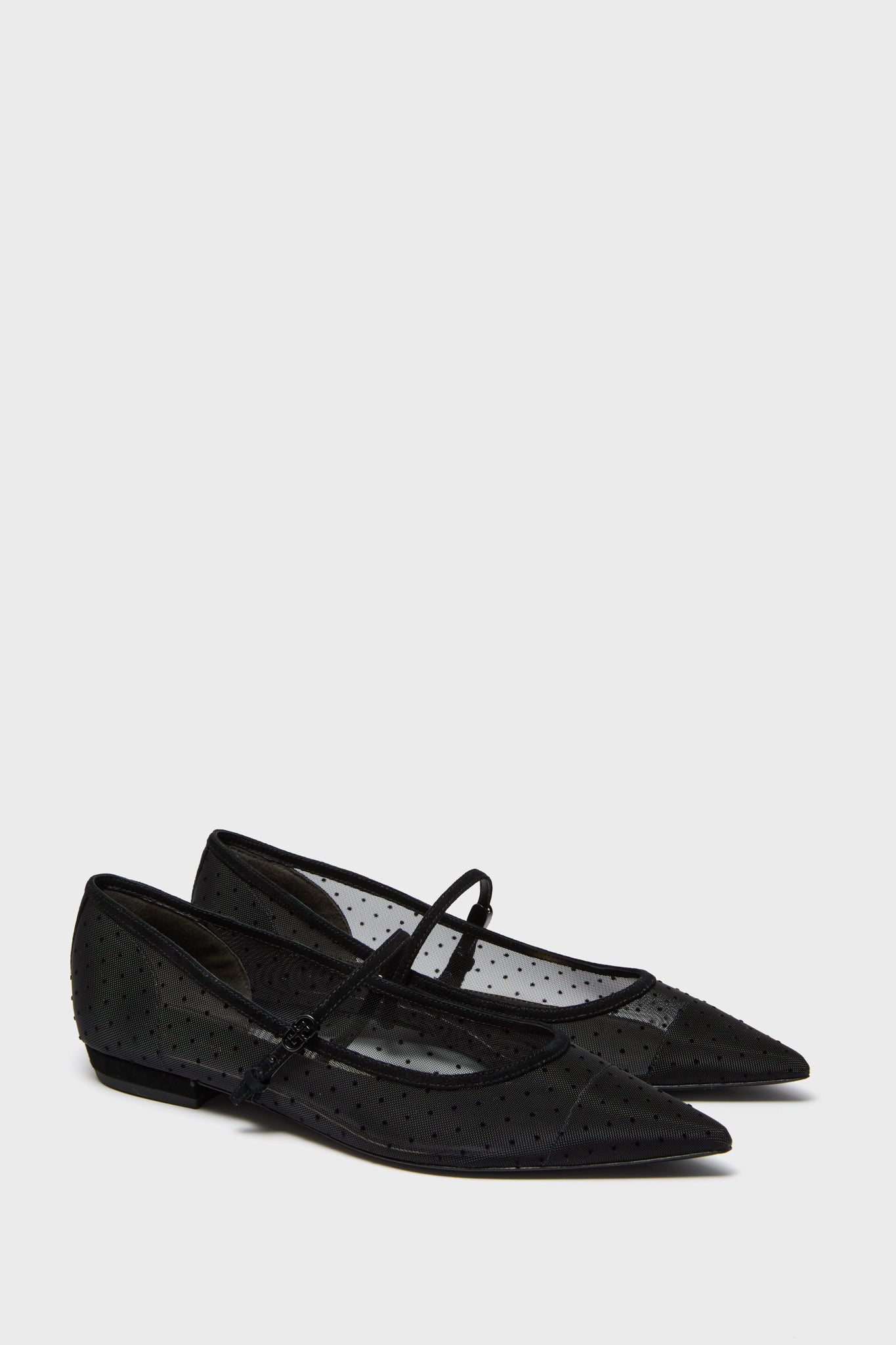 A classic Mary Jane with a refined profile. featuring a pointed toe and slim heel for just the right amount of lift. Crafted in Italian mesh with all-over polkadots and a contrast suede trim. this is the perfect flat for holiday parties. date nights. or just to dress up an everyday look.