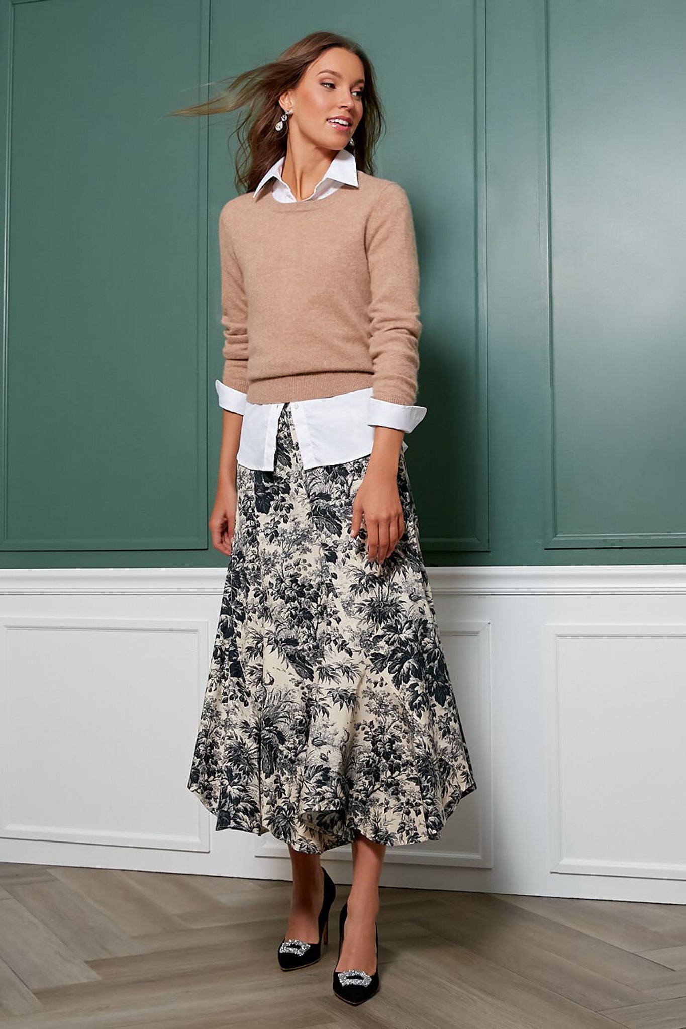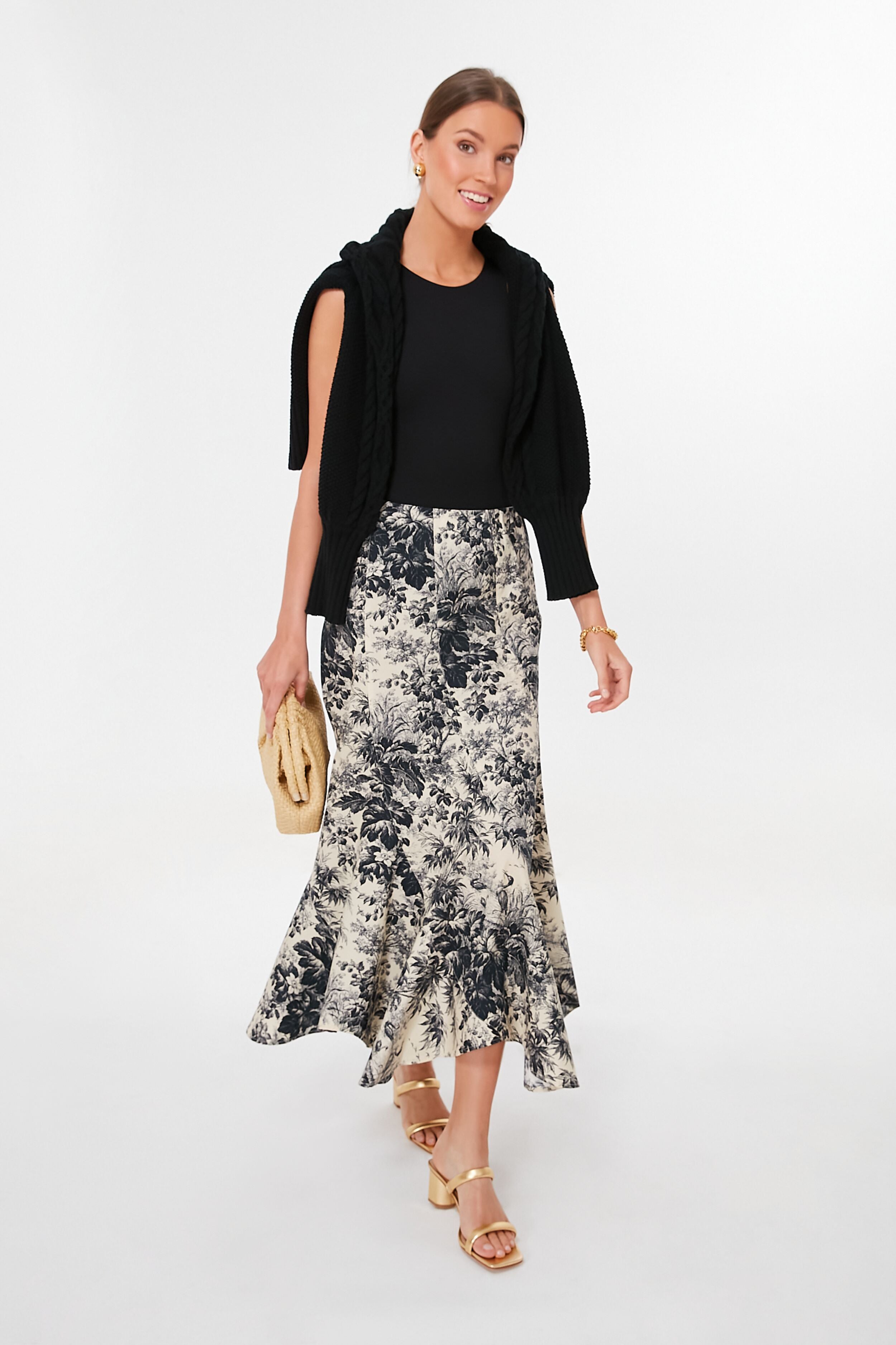 A classic style with a fun printed twist. the Midnight Cypress Toile Mallory Skirt is everything we look for in a maxi. The hidden elastic waist looks effortlessly elegant and offers full support so you won't be tugging at it all night while the A-line silhouette twirls and glides with your every movement. Your new go-to statement piece. whether you're heading to a cocktail party or having a girls day in the city. this contemporary number is the glamorous choice.