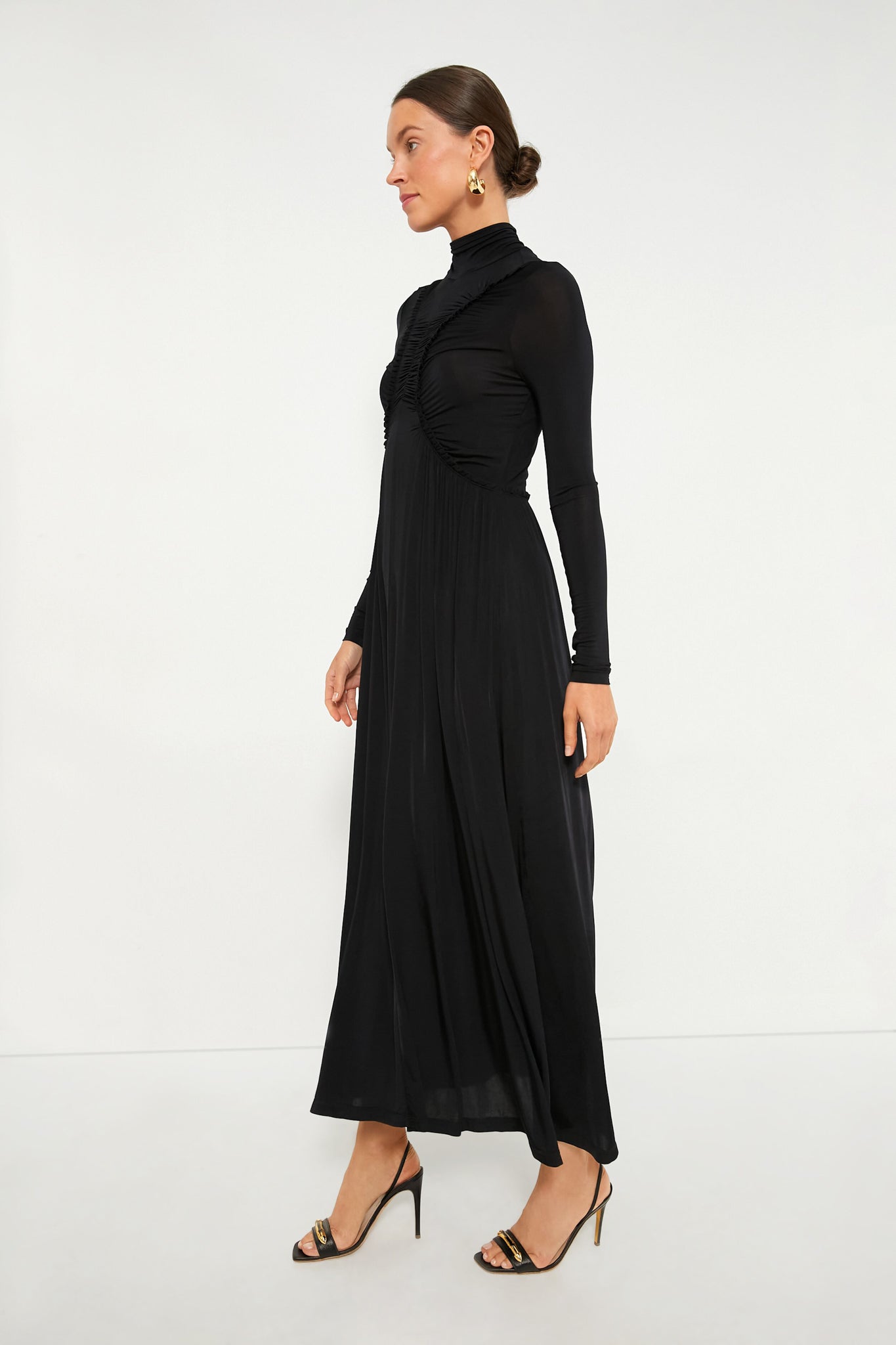 The Noir Oriana Dress is nothing short of stunning. Crafted from lightweight and stretchy tricot jersey. this midi in forever classic black features a body-skimming turtleneck frock has architectural seams. soft gathering. and long sleeves. Finished with a concealed back zipper. pair with a clutch. glitzy jewels. and strappy heels. perfect for making an entrance to your next occasion.