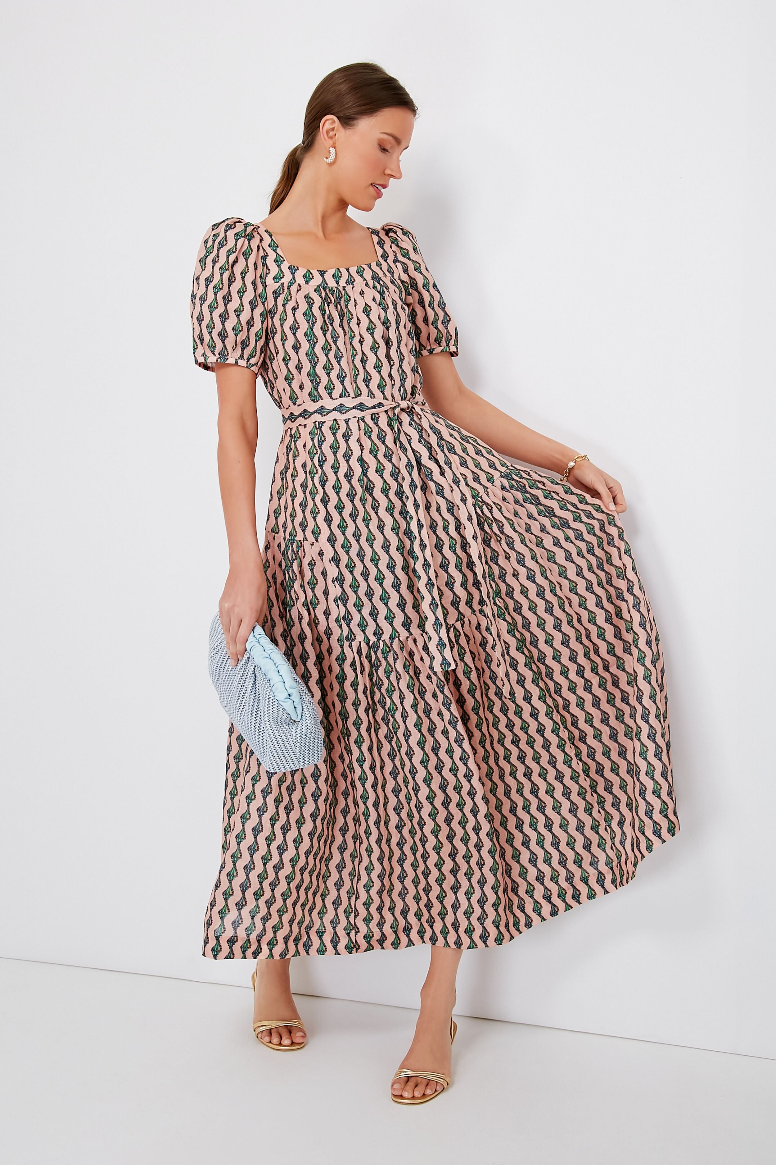 Linear ribbons of jade conch shells cascade down a soft pink linen base on the Ocean Stripe Yashi Dress. Effortless elegance is the name of the game for this maxi. with its square neckline surrounded by gathered pleats. puffed shoulders. self-tie belt. and more delicate details that seem little but add up to a whole lot. An ideal choice for the upcoming summer season. this silhouette pairs gorgeously with heels and a clutch to attend a destination wedding. or with sandals and gold jewelry for evening plans all season long.