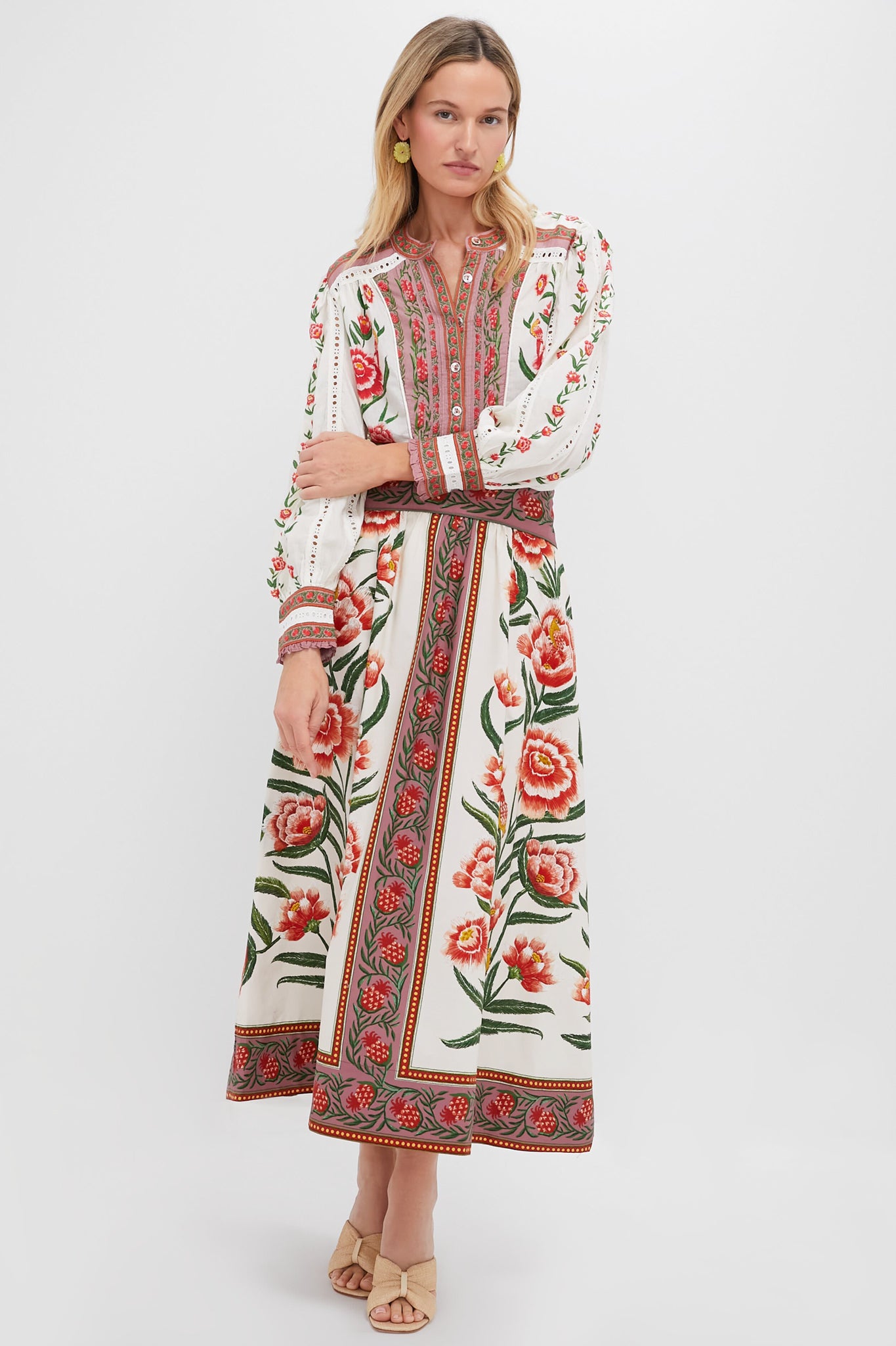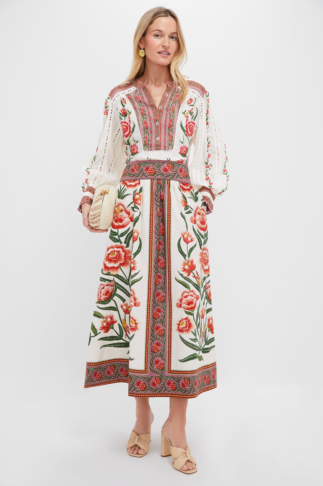 The Off White Delicate Ainika Blouse features beautiful floral print with intricate eyelet embroidery that create a stunning silhouette. Perfectly crafted to make you stand out. we are styling it with the matching Off White Delicate Ainika Midi Skirt and heels for a chic set.
