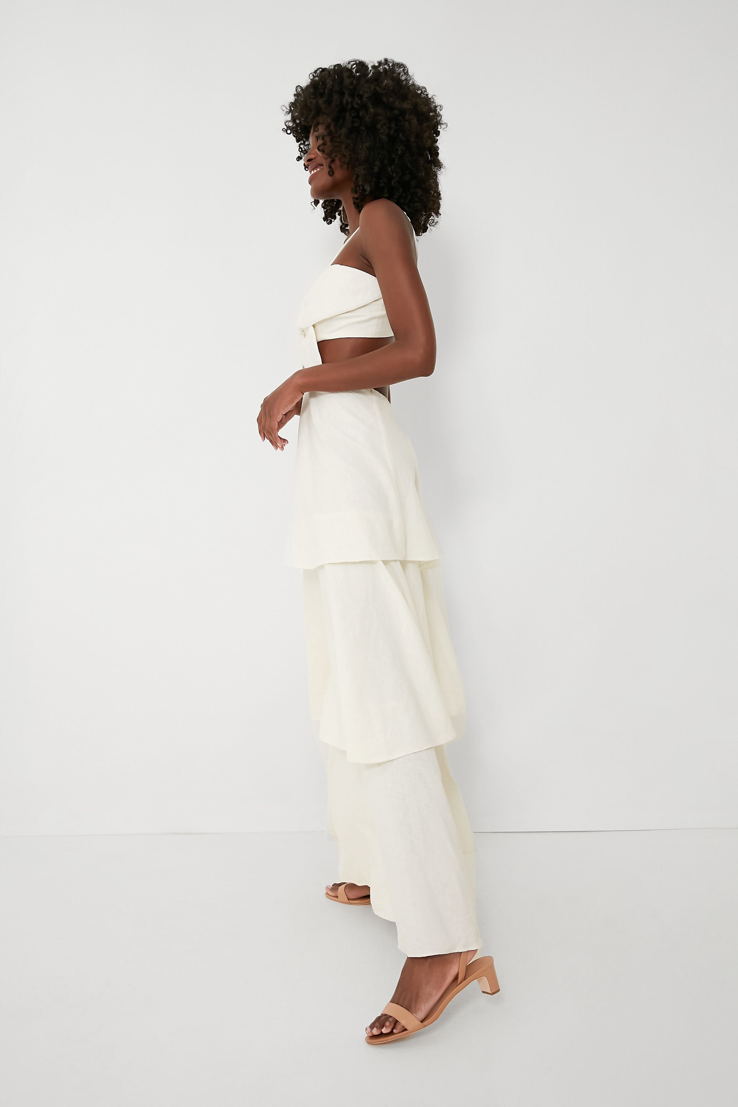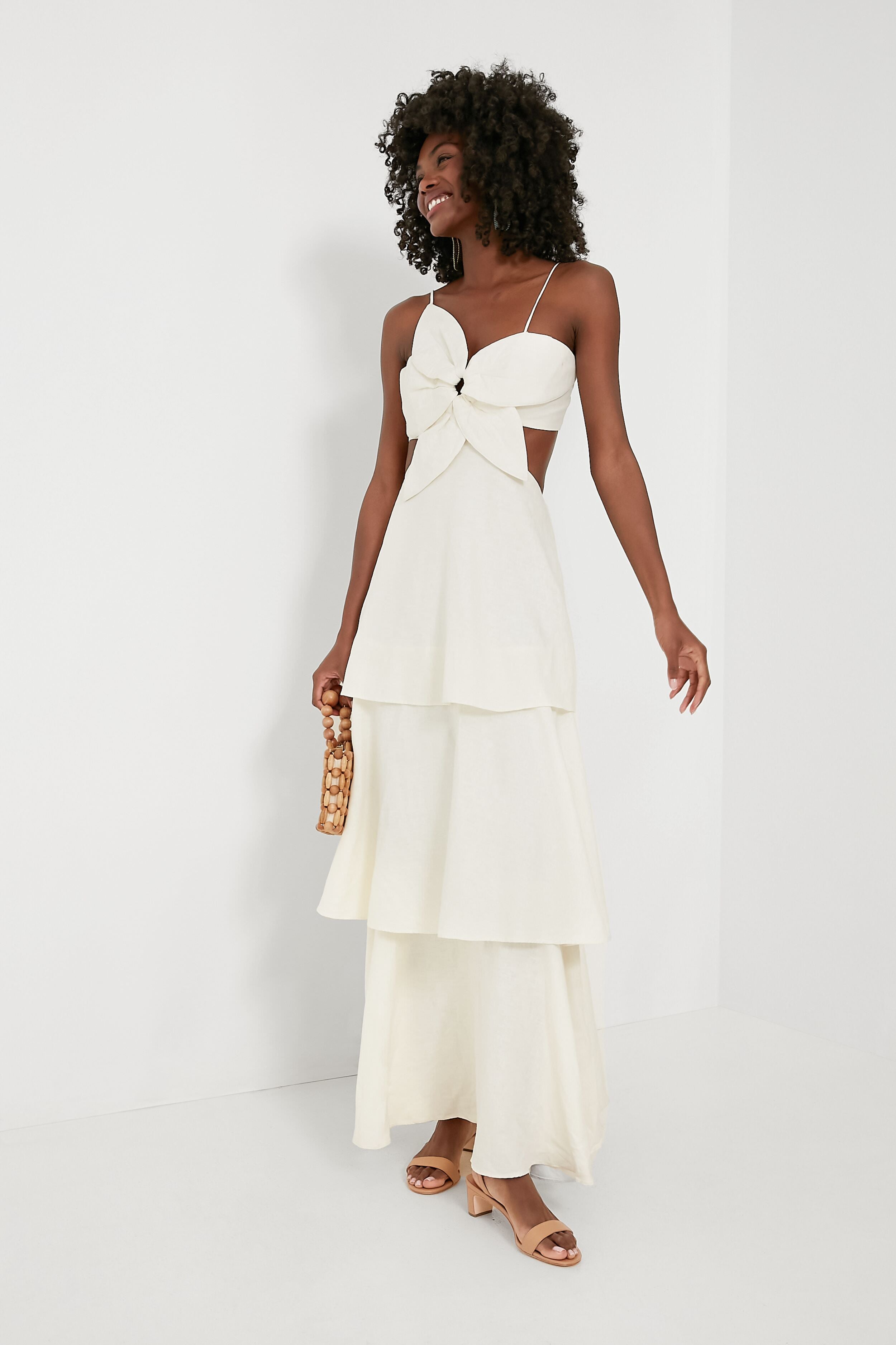 Elegant and elevated. we can't get enough of the Off White Flower Maxi Dress. With delicate adjustable spaghetti straps. petal-like accents on the bodice. and side cutouts that lead to an open back. this breathtaking maxi does not skimp on the details. Made from a light and airy linen-viscose blend with a layered tiered skirt that was made to float on warm breezes. you will reach for this silhouette for everything from evening events to romantic dinners — just pair simply with heels and gold jewelry and let this special style take the lead.