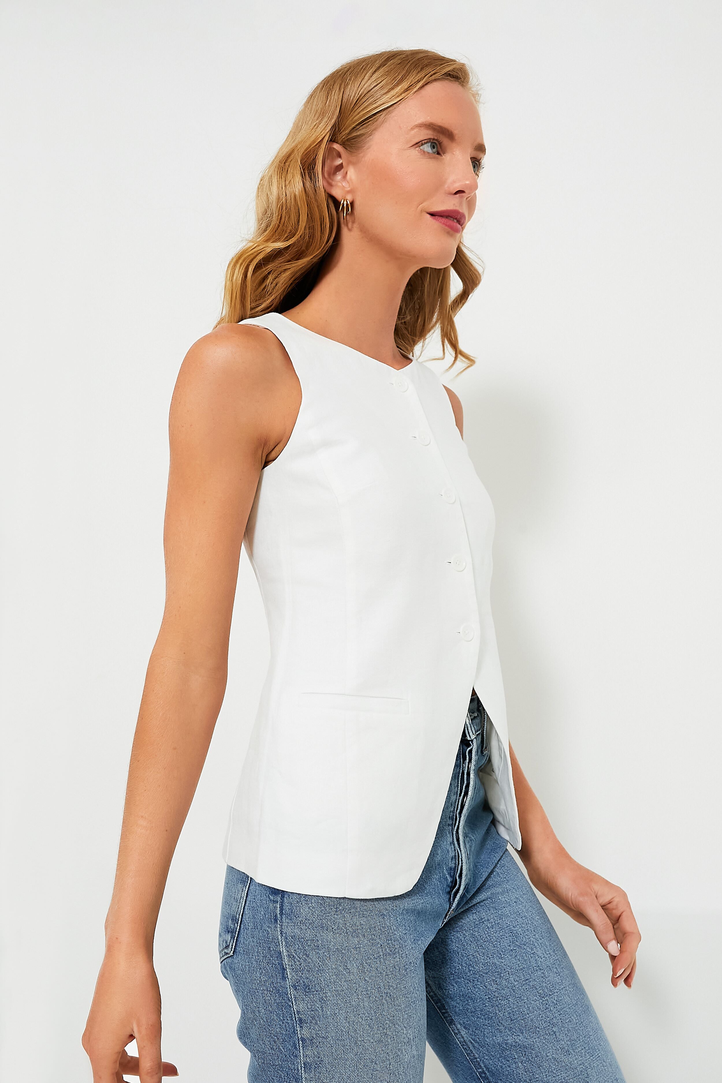The Off White Liv is a classic vest thats made longer aka cooler. Made from premium linen. this chic silhouette has a functional front button placket. side welt pockets and is finished with angled hems. Pair with denim and sandals for an easy outfit formula or with shorts and a basket bag for a statement look. Pants.