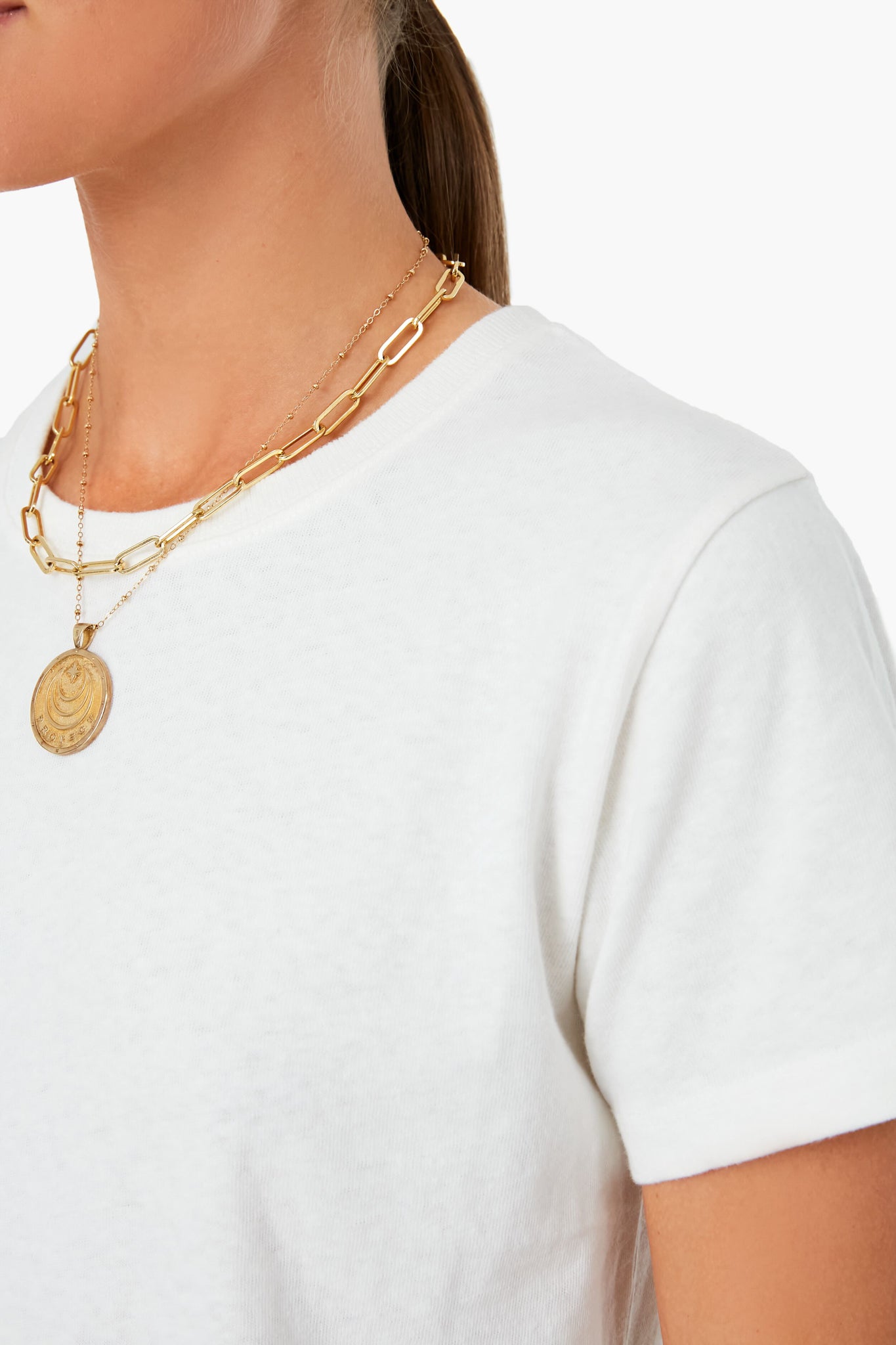 You can never go wrong with a classic! The Off White Vintage Crewneck Tee is made from slightly textured recycled cotton. in an effortless silhouette which can be thrown on for any occasion. In a slightly cropped length. meant to hit right at the top of your high-waisted denim. this shirt looks as great layered under cardigans or jackets as it does on its own with timeless gold hoops.