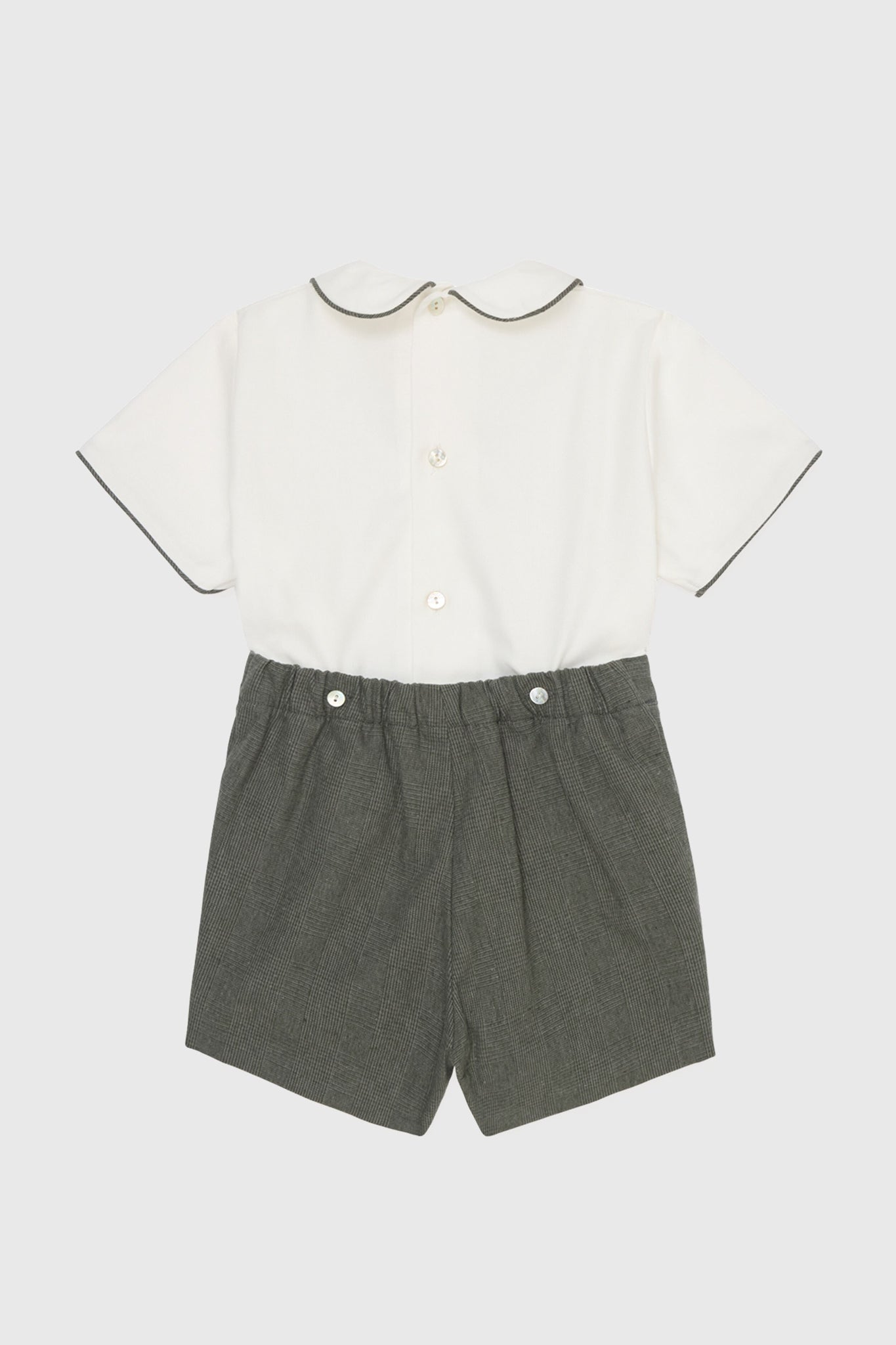 Crafted from premium blend of cotton and linen. this refined two-piece set includes a crisp white shirt. featuring a classic Peter Pan collar. delicate green piping trims. and covered buttons. The attached bloomers are crafted from traditional olive green tweed. features short legs and an elasticated waistband for comfort and full coverage. ensuring easy changes throughout the day. making it ideal for special family occasions.