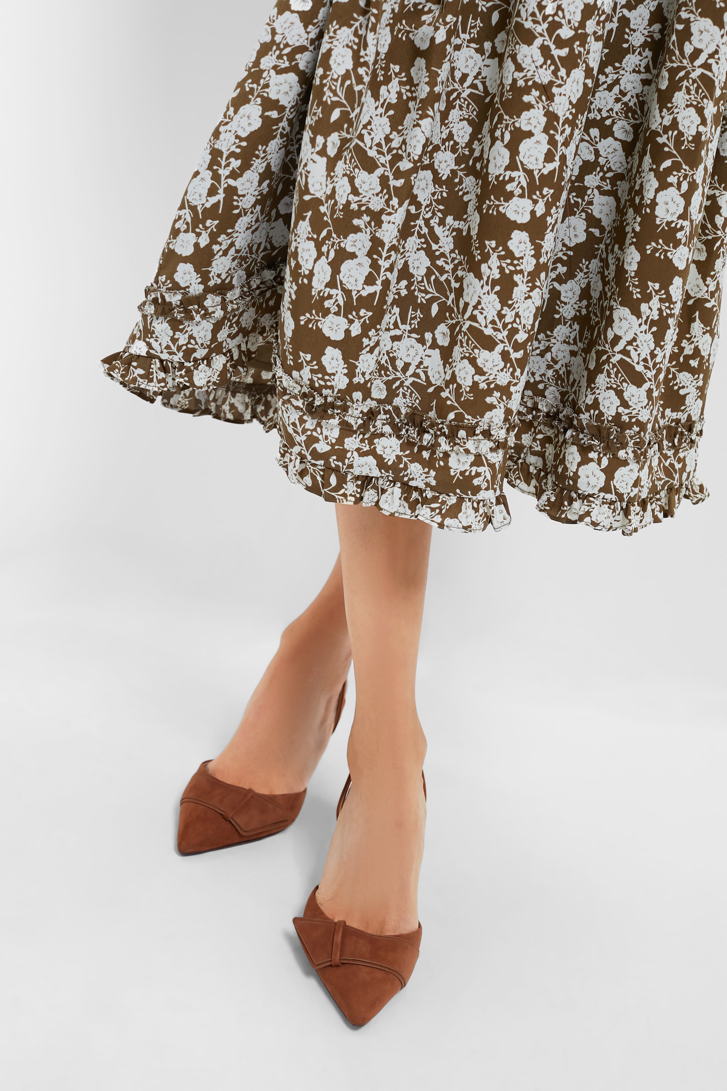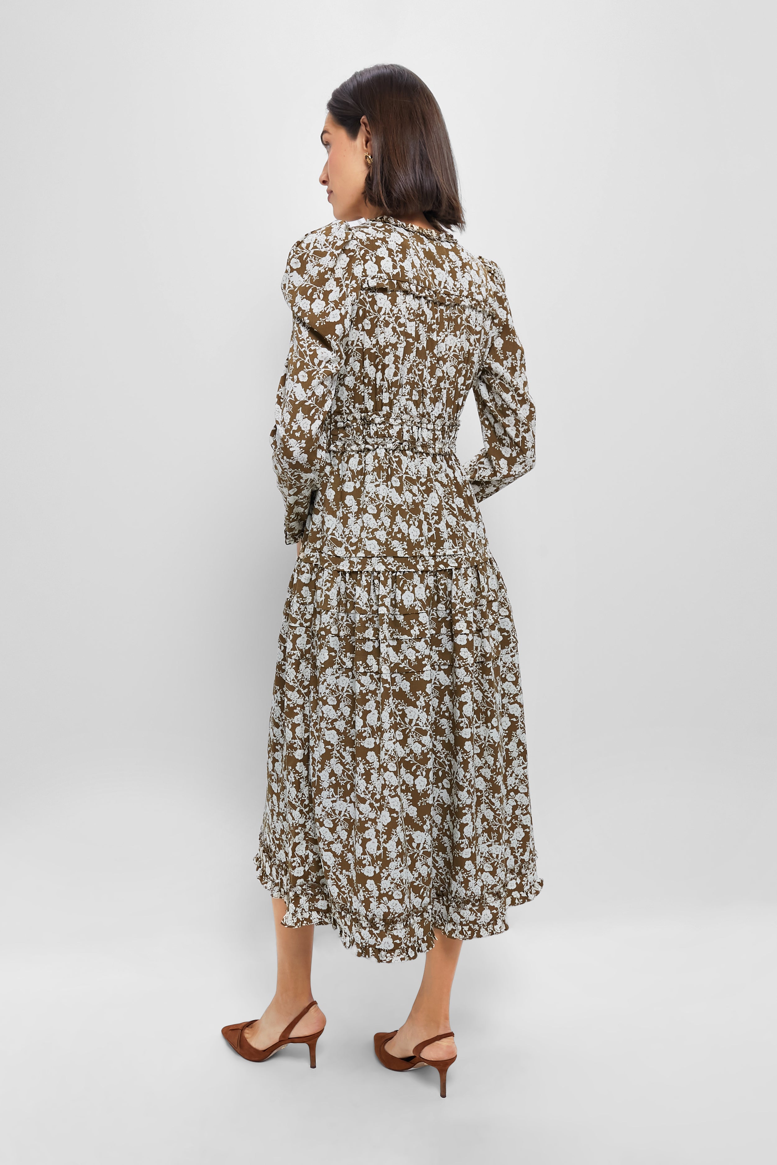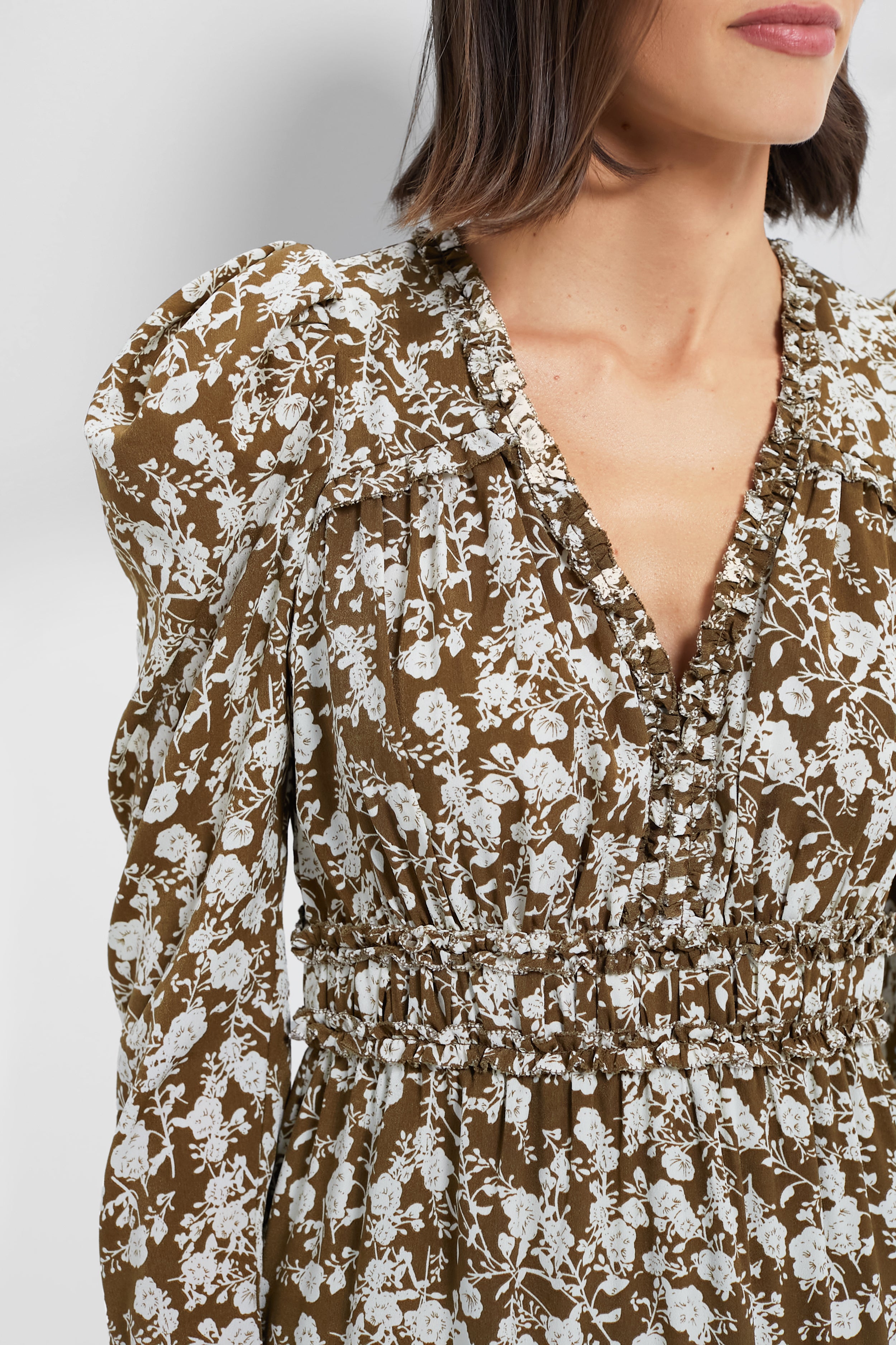 Flirty silhouette. transitional olive hue. eye-catching floral print - what's not to love about the Renee Dress? Featuring feminine ruffle details and a twirl worthy skirt. there are endless ways to style this stunner. We're pairing with booties. a leather crossbody and gold jewelry for an outdoor concert. or swap into flats and add a jean jacket for a laidback lunch.