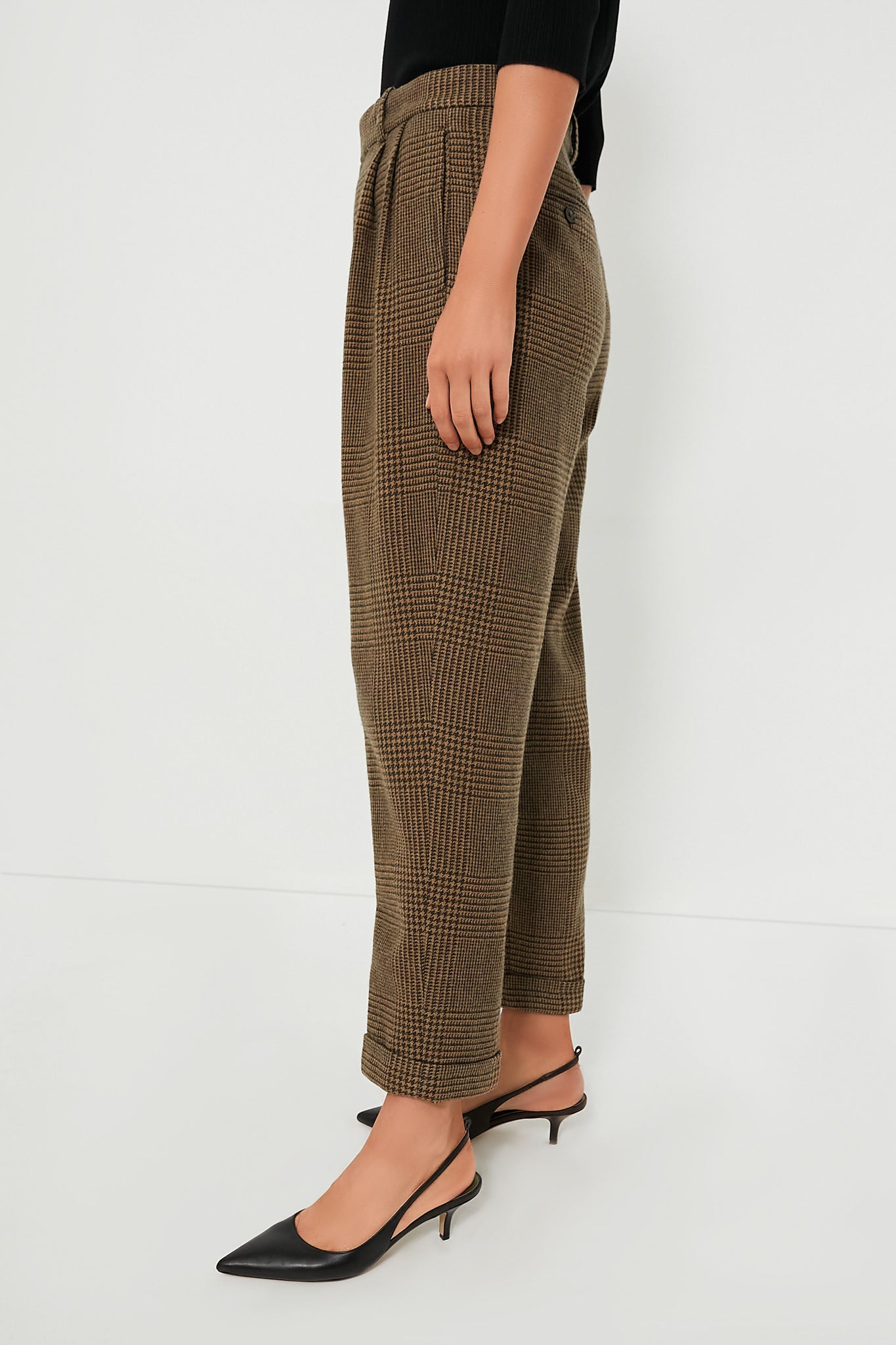 The Olive Glen CHeck Cropped Trouser is making us all eager to dress for fall! Featuring a mid-rise waist. folded cuffs. and front waist pleating. this pair of pants will be a perfect pair to have on repeat as the weather gets colder. Style with a long sleeve top and kitten heels for a transitional look to wear out of the office or throw on a chunky knit sweater and loafers for a wine tasting weekend.