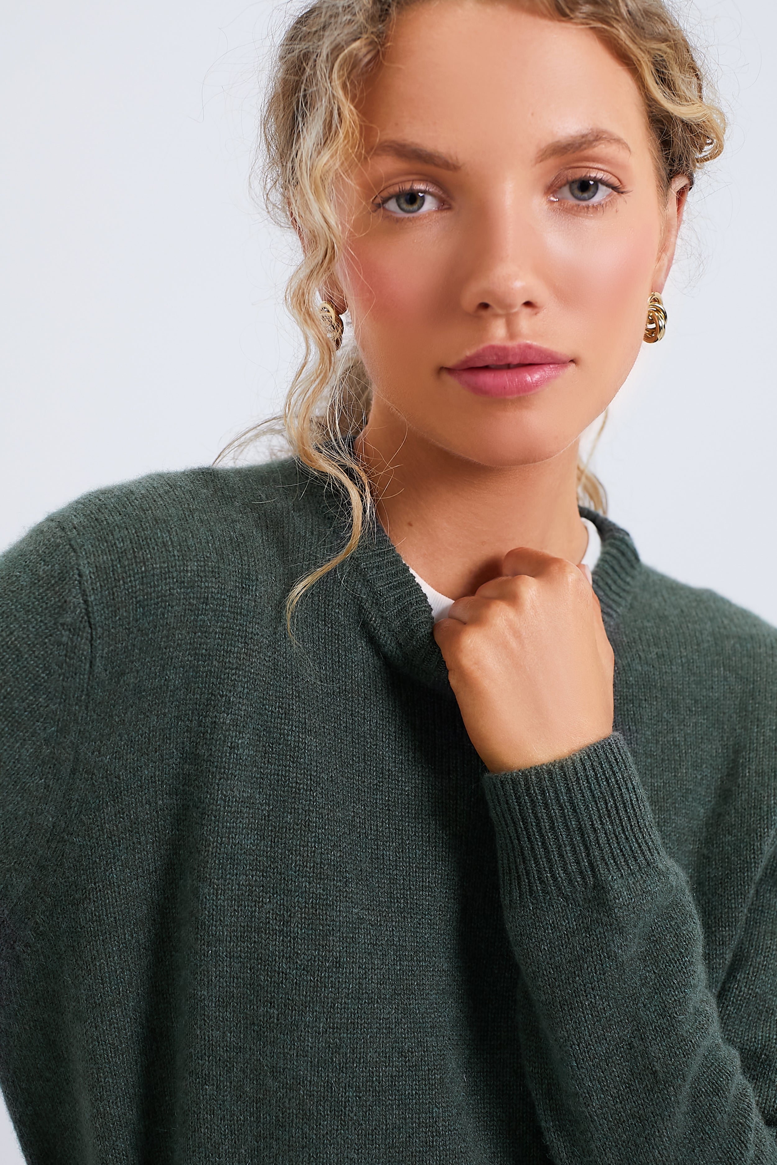 The Olive Green Bodie Cashmere Boyfriend Crewneck has everything that we want in a style- a staple color. comfortable fit. and chic design. Made from an ultra-soft cashmere. this style is ideal for year-round wear. Throw over your shoulders with a shirt dress and sandals in the summer. or wear with wide leg jeans and boots in the winter.