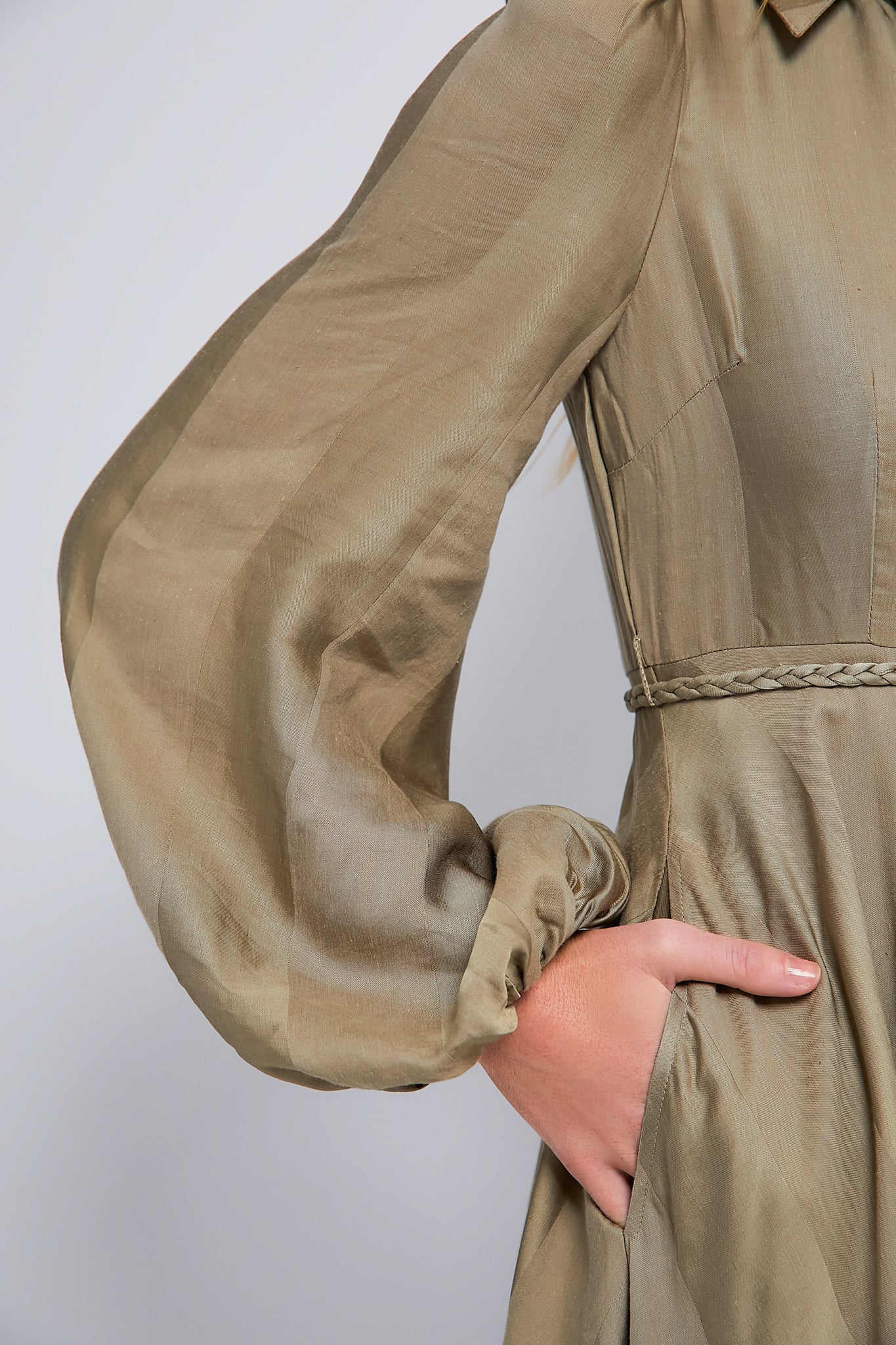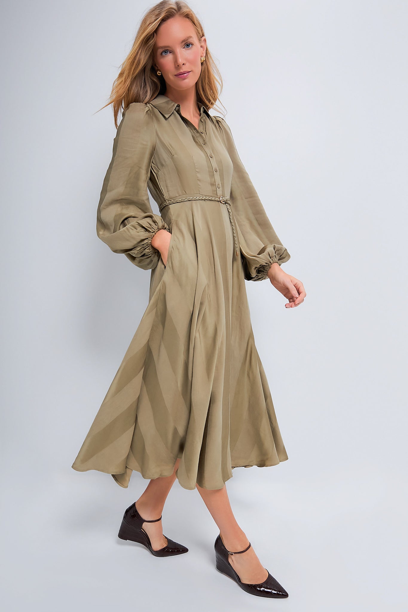 The Striped Button-Down Dress is cut in a delicate and shiny viscose-linen blend. with long voluminous sleeves and an adjustable braided belt. Pair with boots for a more casual look. or dress up with heels and a gold clutch.