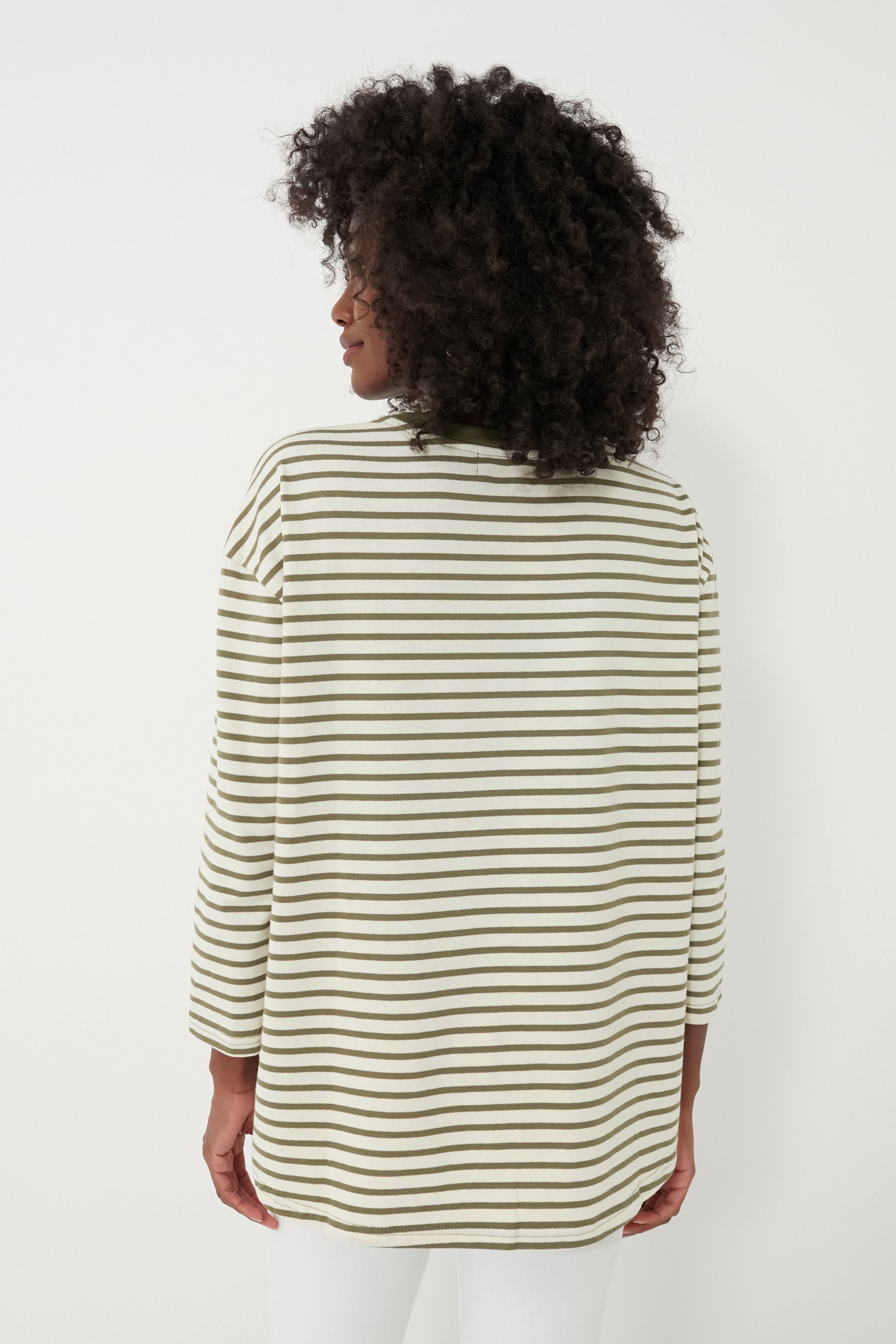 A sporty swap for your go-to tee. the Olive Striped Knit Popover adds a little something extra to your dressed down days. Cream and green hues create a vintage feel while the modern stretch knit fabric and swing shape guarantees this will be in your wardrobe for years to come. We are pairing this with denim. sneakers. and sunnies for lowkey days. and adding flats and a sweater over the shoulders for a fun play on layering for brunch with friends.