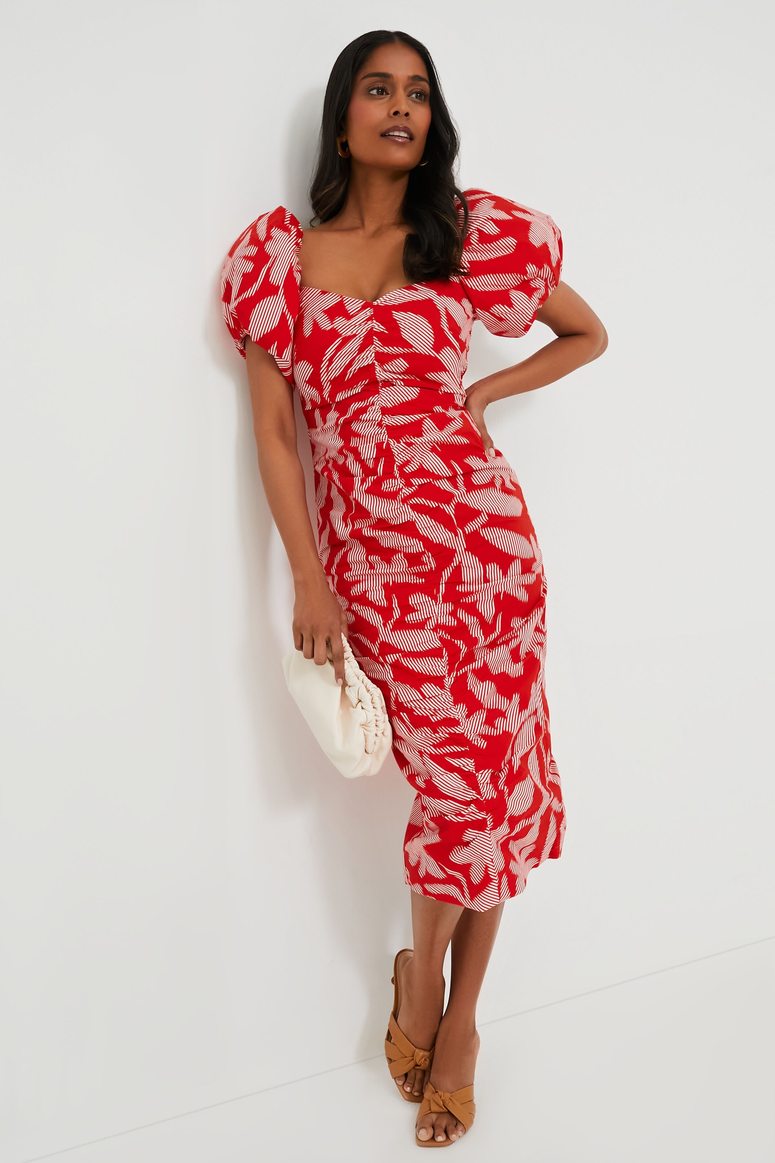 The Optical Floral Tessa Dress delivers luxe sophistication. Beautifully crafted from breathable cotton in an eye-catching floral print. this midi features a darling sweetheart neckline. puffed sleeves. a flattering ruched detail down the front which all make this number  something totally special. Finished with a back slit. style with strappy sandals and gold jewelry for a stunning date night look. or dress it up with heels and a clutch for all of your formal functions and fabulous RSVPs ahead.