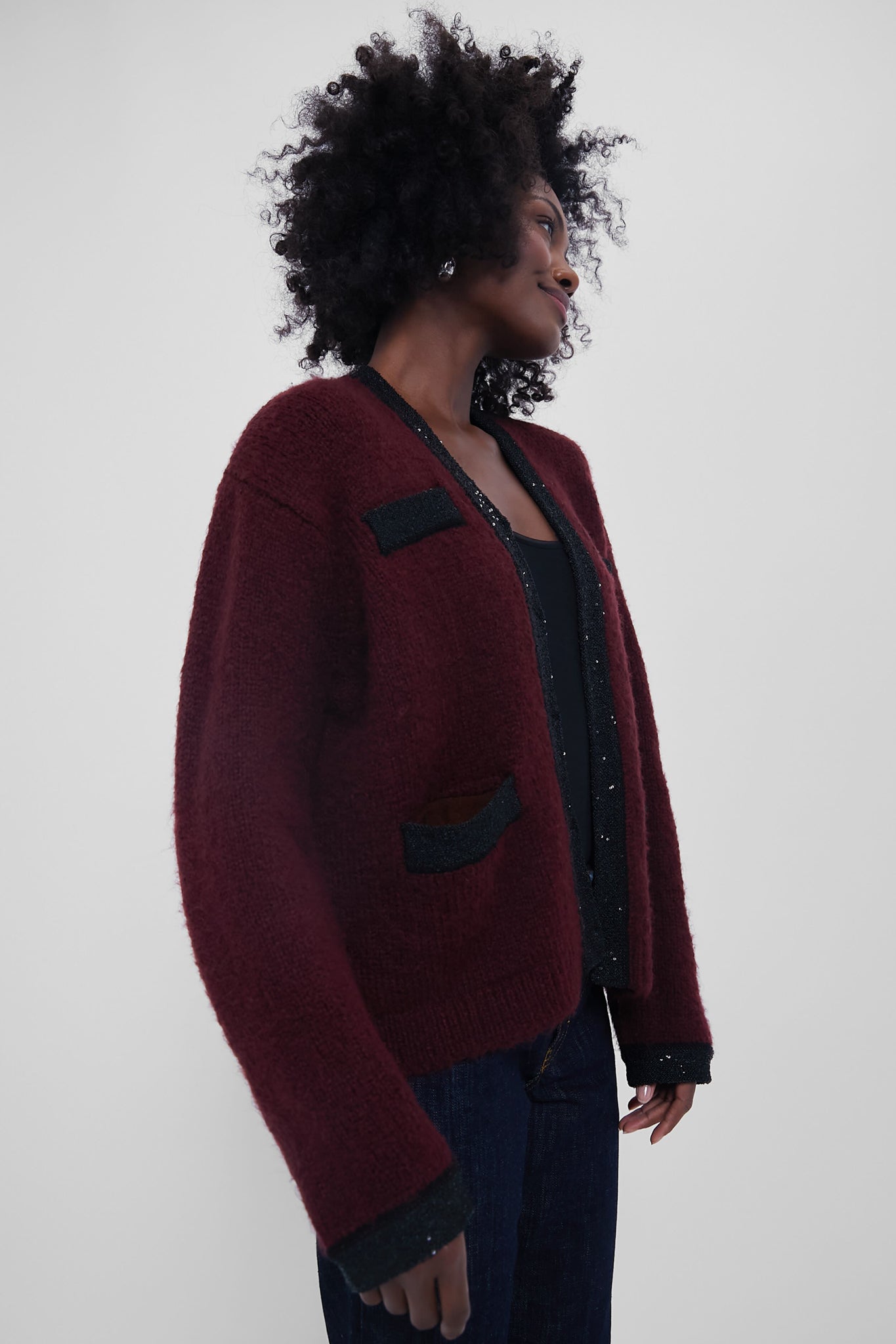 The Oxblood Boucle Fallon Cardigan is an upgrade to a classic look with four front pockets. a hook and eye closure. and a chic colorway that is perfect for the cold weather months. Pair with a tank and denim or a maxi skirt and boots!