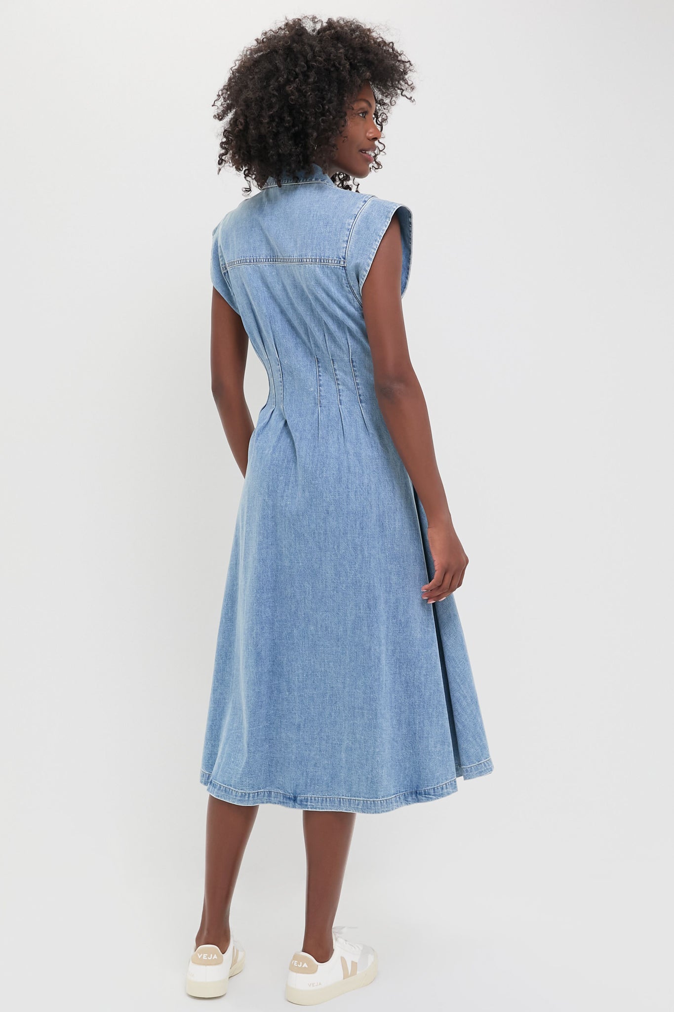 Made from pure cotton denim. the Pebel Stone Ruben Dress is a midi style defined by a relaxed fit and darting that cinches in the waist. Finished with cap sleeves and a collared V-neck. pair it with flat sandals for getaways and everyday.