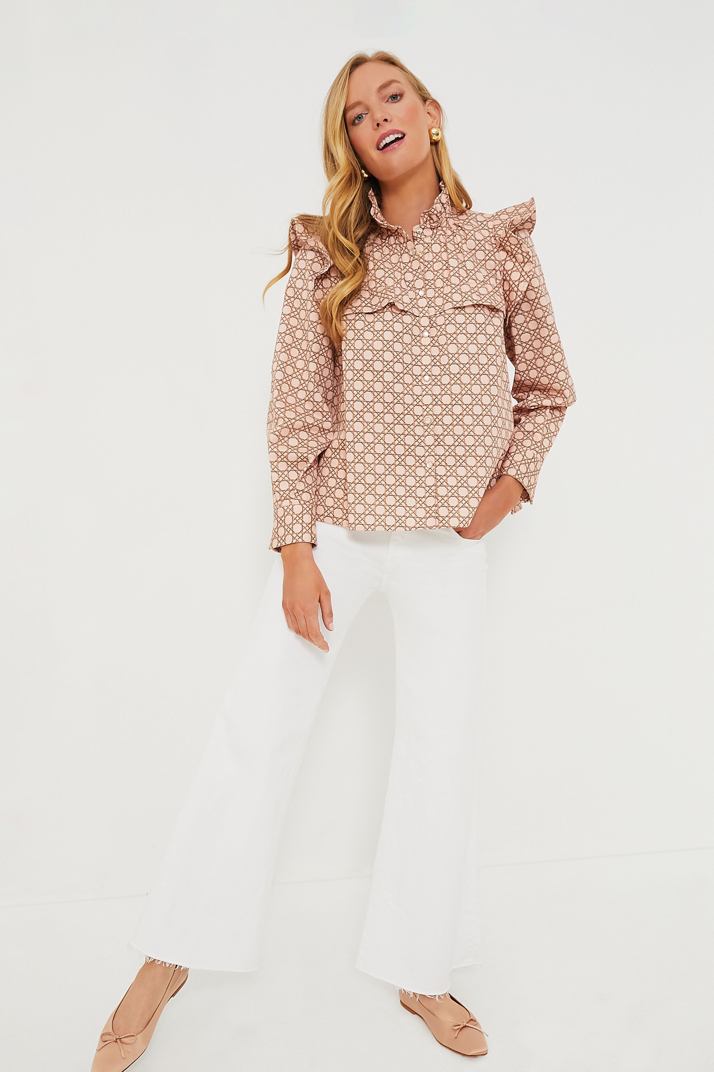 An playful update to the classic button down. the Petal Cane Winnie Blouse is the seasonless style that you will have for years to come. Easily paired with light or dark denim. skirts or shorts. tucked in or out. this top perfectly embodies unfussy femininity without limiting your styling options. In a classic yet eye-catching geometric pattern and ruffle details have us swooning for this full of personality top!
