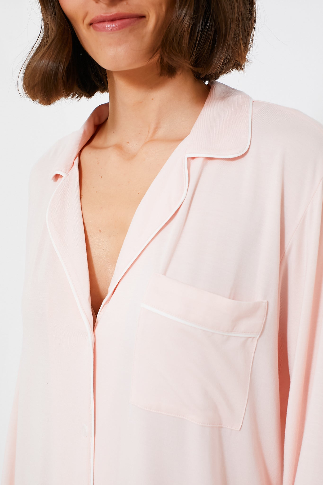 It doesn't get better than the Petal Pink Gisele Sleepshirt. merging a classic men's PJ silhouette with sustainable TENCEL™ Modal fibers. The luxurious. temperature-regulating knit fabric drapes and falls in all the right ways. enveloping the body in comfort. Plus. it's machine washable. and gentle on skin. so it not only feels beautiful but it's easy to care for. too.
