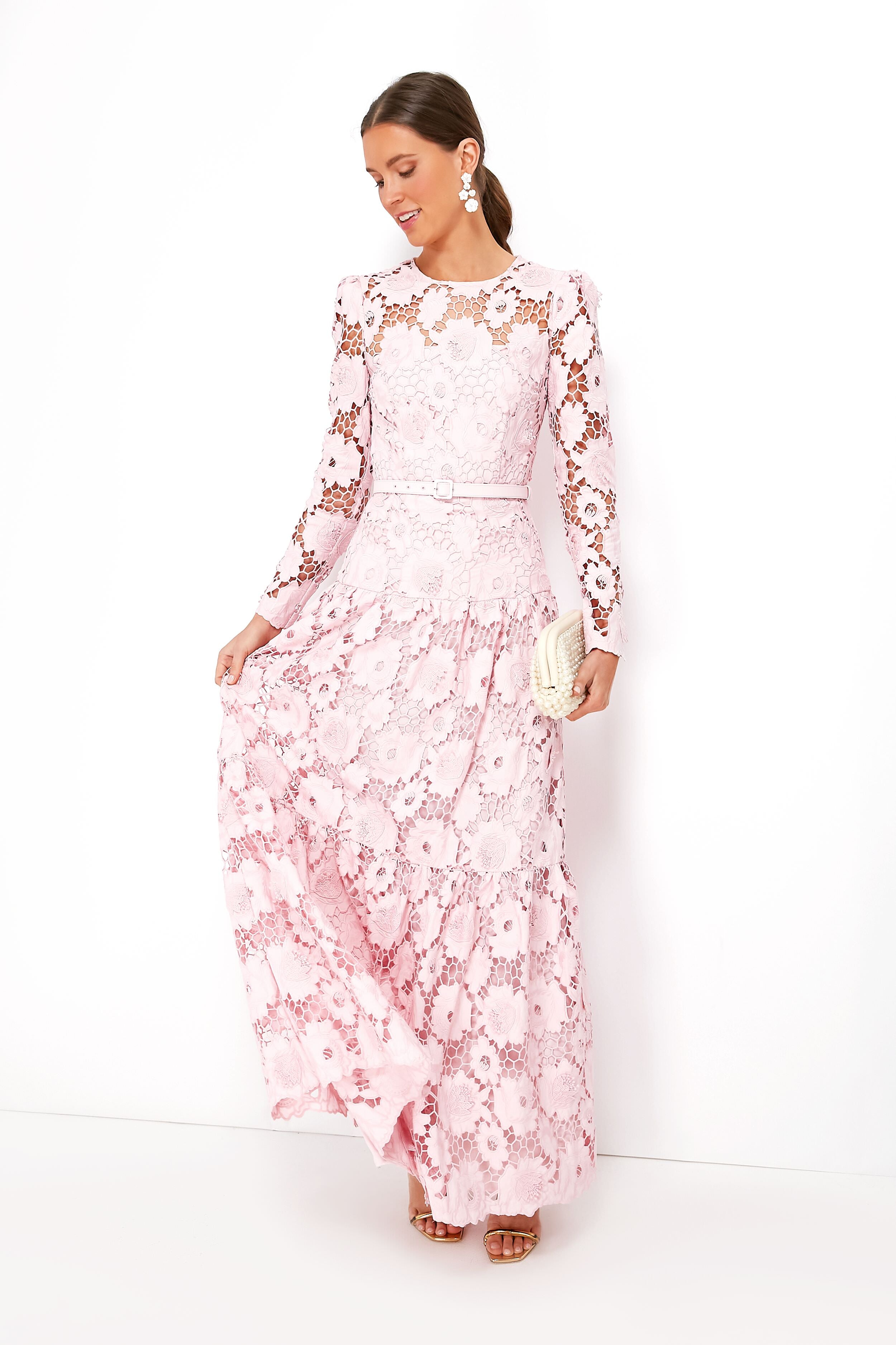 A lesson in effortless elegance. the Pink 3D Cotton Lace Dress gives the illusion of flowers tumbling down the body. Featuring a floor-sweeping maxi hem and a column silhouette. this stunner's nipped-in waist feels ultra-classic while its fabric that reveals subtle flashes of skin adds a modern twist. The perfect event look for just about anything on your social calendar this season. this rosy number pairs well with neutral heels for an understated look or with statement jewelry if you want to go bold.