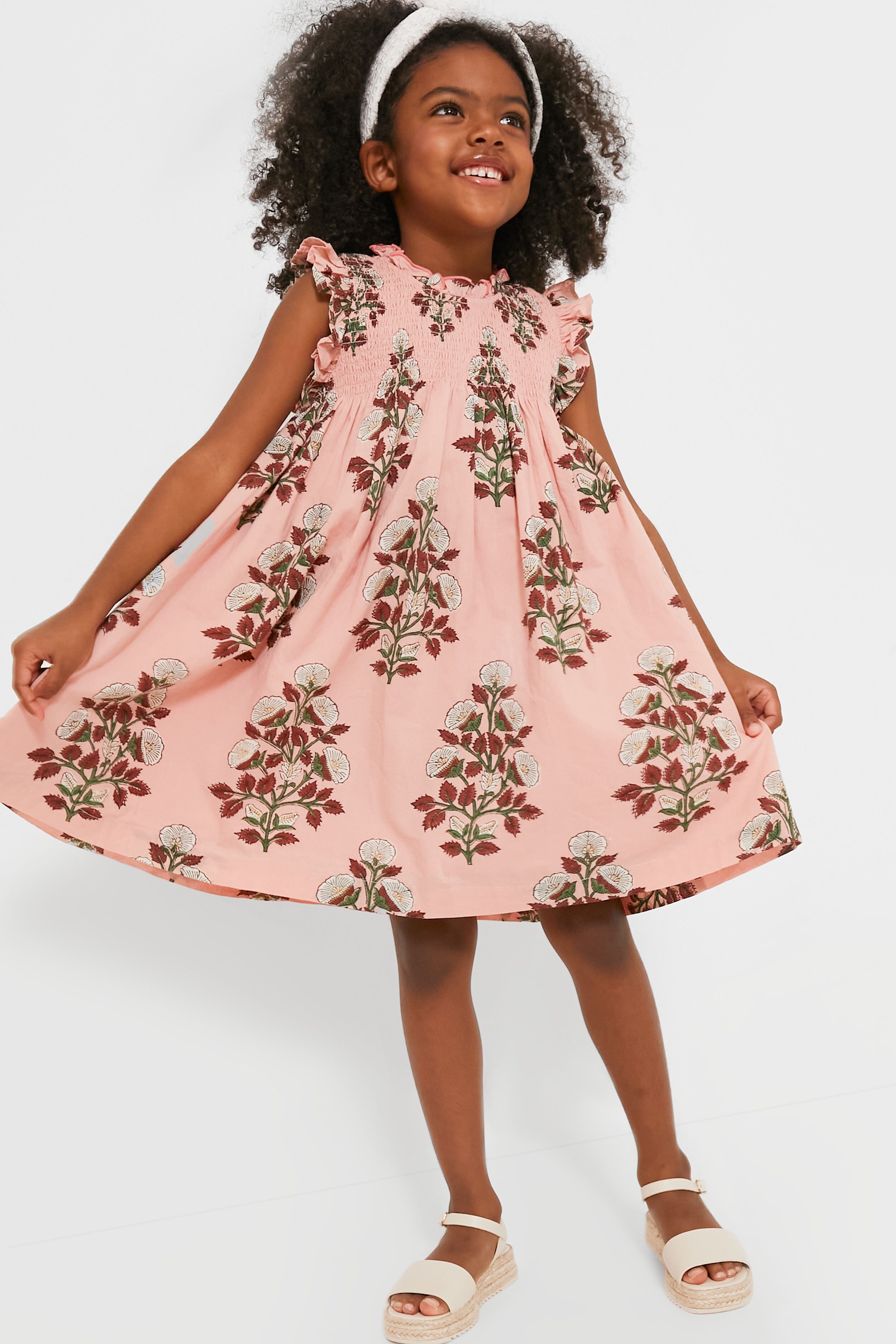 Pretty in Pink! Your little girl is about to look absolutely adorable in the Bouquet Floral Stevie Dress. A gorgeous spray of white blooms on a vibrant vine pops off the dusty pink ground. this flock favorite features a ruffle at the neckline and arm. smocking at the chest and an invisible zipper at back. Pair with a headband for Sunday brunches or picture day at school. and wear it with sandals for fun in the sun.