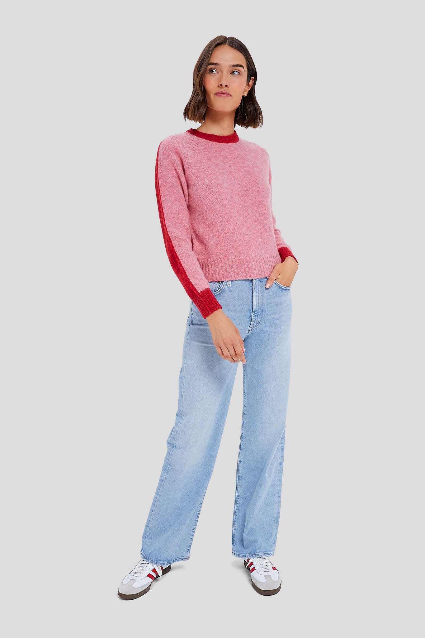 Hand-knitted from ultra-soft shetland wool. the Grey Julio The Pink Fergus Pull is so cool. cozy. and comfy that you'll be wearing it on repeat all season long. With a fun color blocking on front and back. this cropped jumper works just as well dressed down with leggings and a tote as it does dressed up with sleek denim and boots.