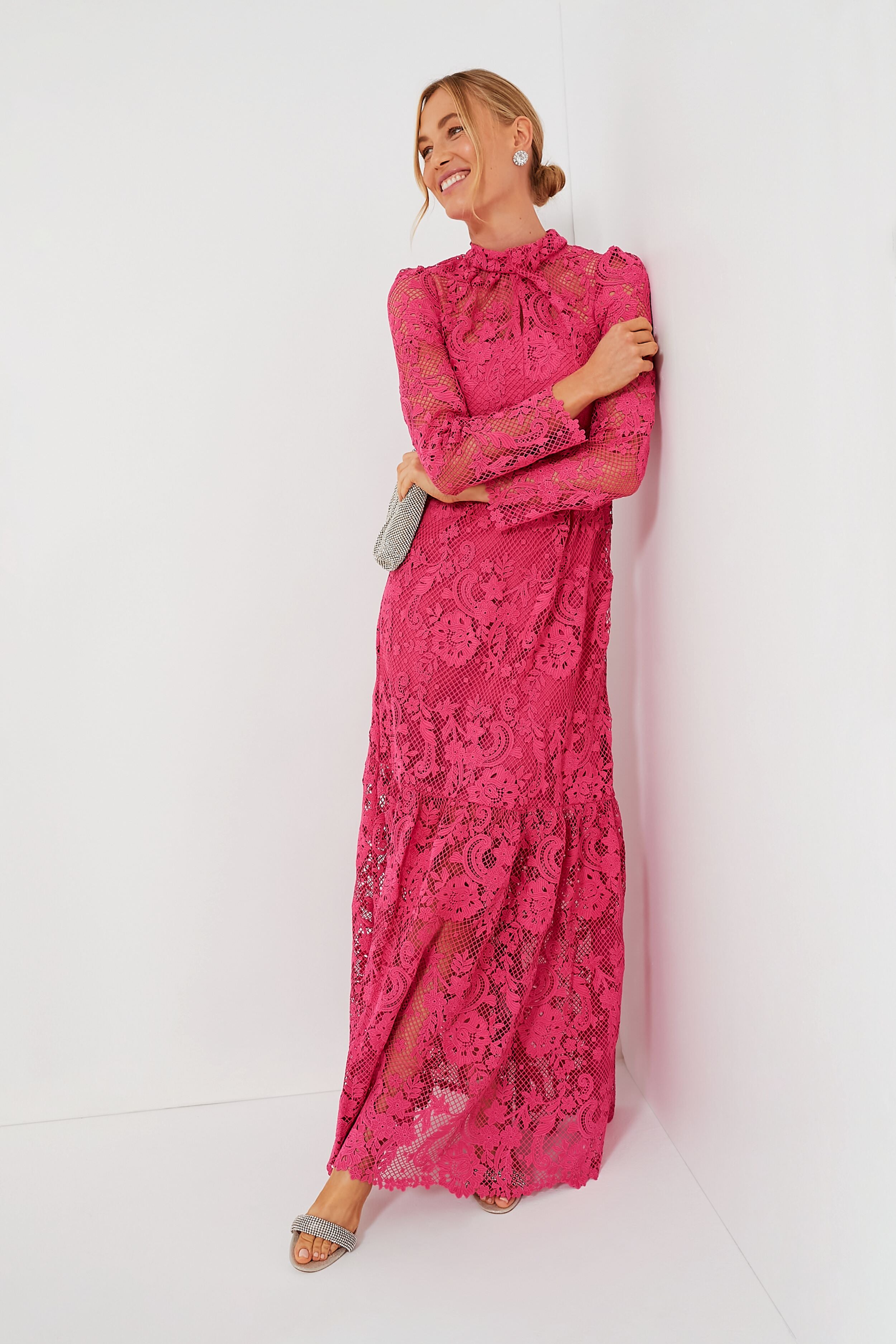The Pink Maxi Dress is stunning from miles away with its striking hue and gorgeous all-over lace detailing. Featuring a twisted mock neckline. a keyhole cutout at the back. and slim long sleeves. we are giving this silhouette a standing ovation. Style with statement earrings and pumps for star-studded parties and outdoor weddings — just expect to be crowded with compliments!