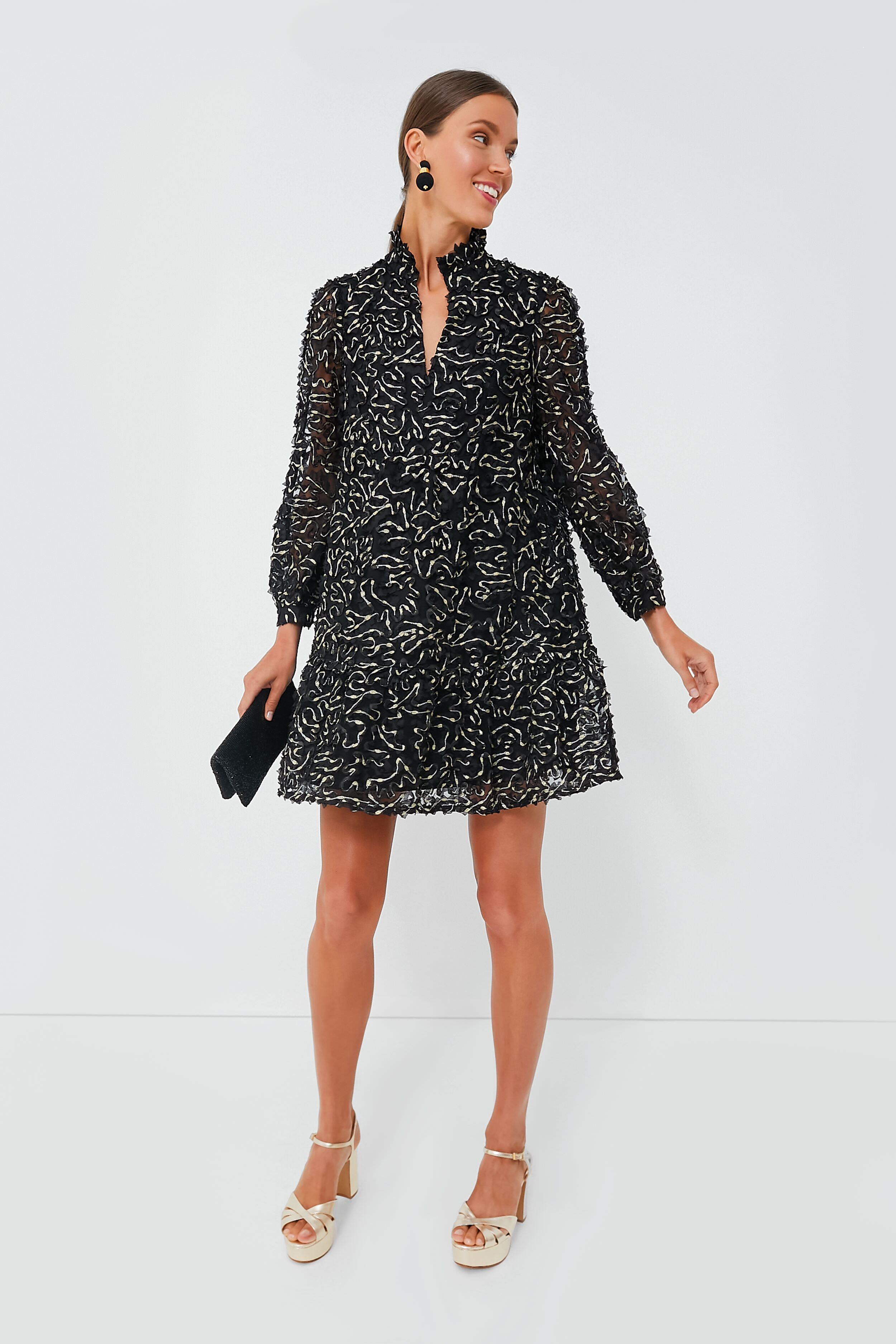 These classy. shimmering heels by Schutz are our new favorite party shoes. The pump silhouette. strappy design. and metallic gold makes these the perfect juxtaposition of sophisticated. fun. simple. and eye-catching. Pair with a mini dress and gold hoops for a date night. or with black pants and a button down for a sleek dinner party look.