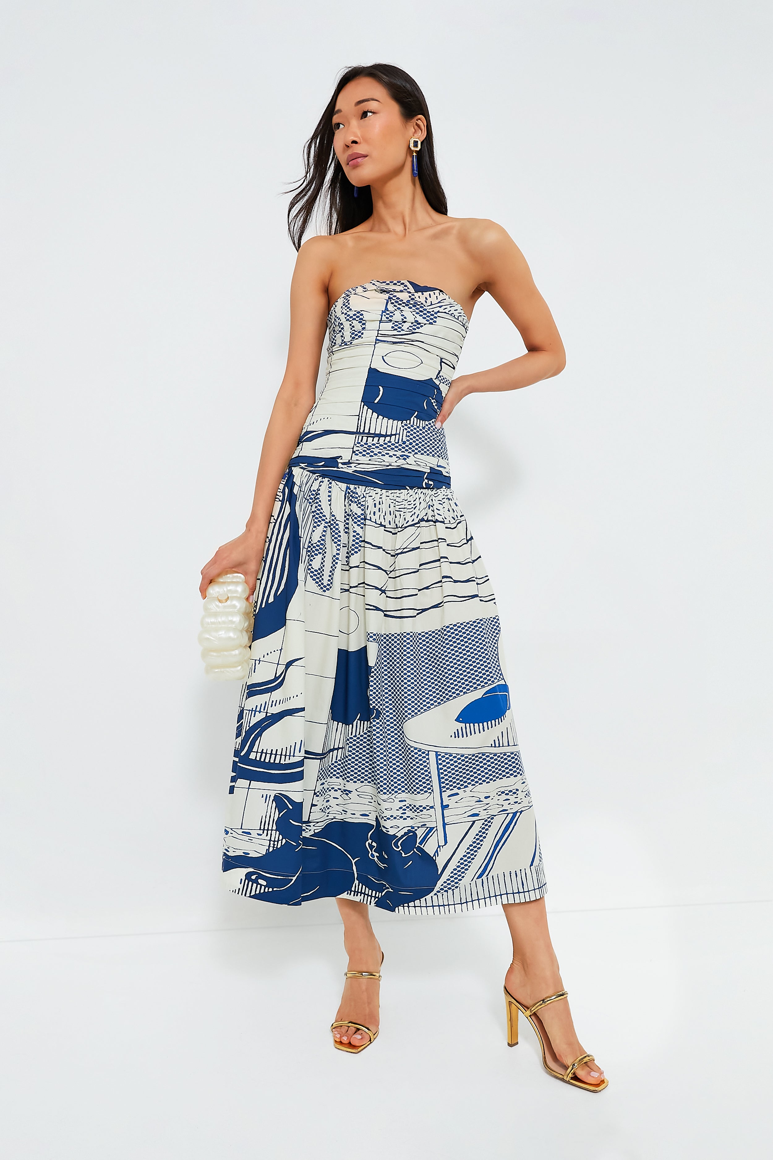 The Playa Print Maia Dress is a piece of artwork that you can wear. This modern. elegant maxi boasts a fitted ruched bodice. a strapless neckline. and a drop waist with a pleated A-line skirt. Made in collaboration with French artist Henriette Arcelin. the eye-catching pattern is sure to make a statement. Pair with heels and bold jewelry for a graceful event look.