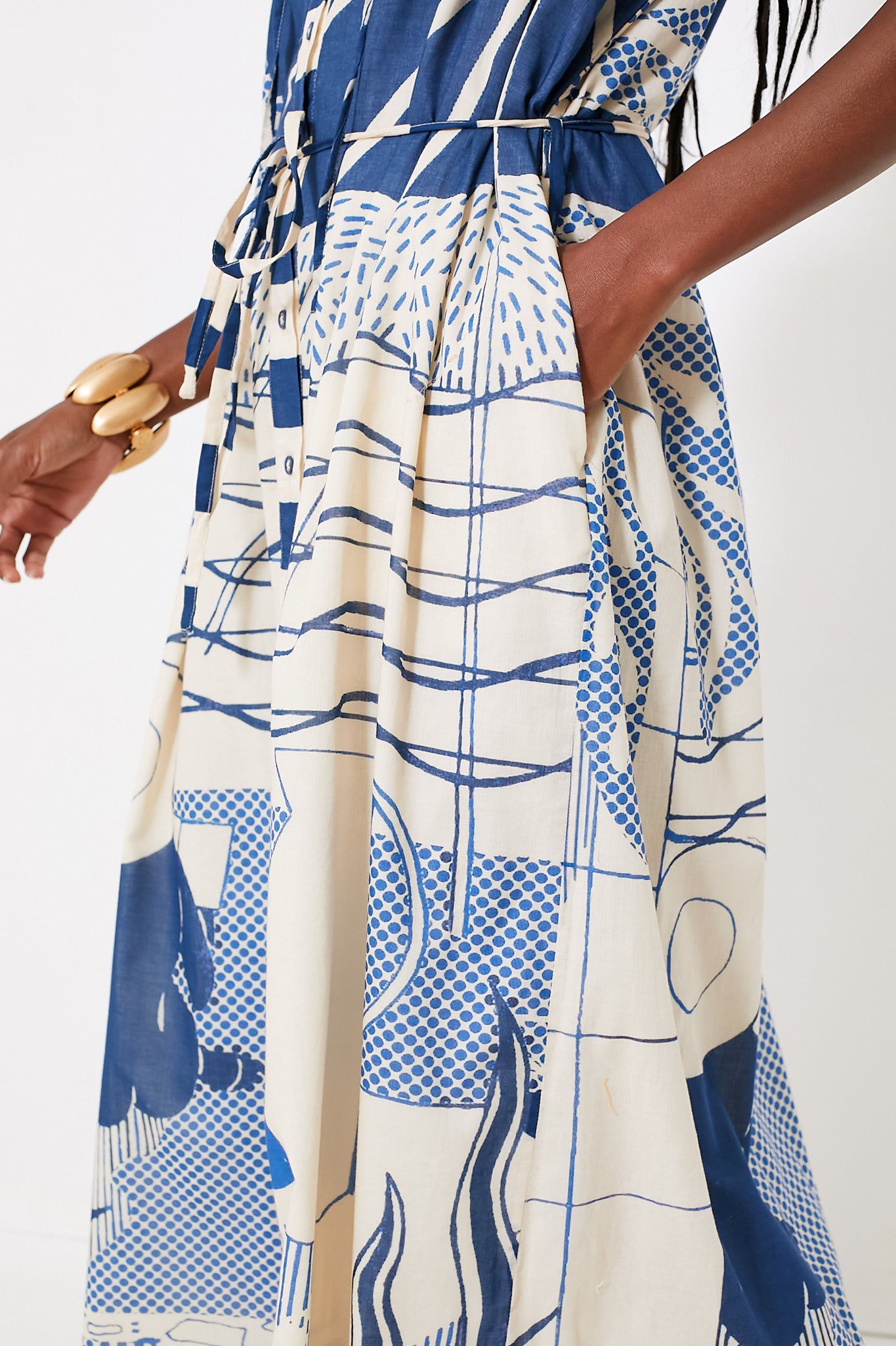 The Playa Print Valerie Kaftan is elegant. intricate. and a piece of wearable artwork. The silhouette of this style features short slanted sleeves with ruffle cuffs. a front button placket. self-tie waist belt. and a ruffle collar. The femininity combines with the abstract blue and white pattern to create an elegantly chic look. Pair with ballet flats. sandals. or heels and accessorize with jewelry!