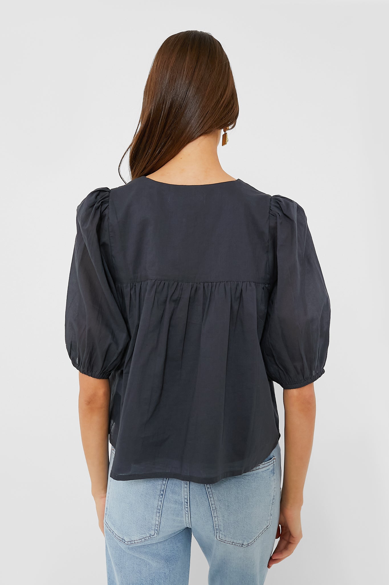A well-loved silhouette season after season. the Organic Puff Isla Top is back in a chic new Polar Night colorway! Crafted from cotton for a breezy feel and a beautiful drape. this darling blouse features a split neckline that can be tied closed or left open for a sultry touch. Finished with puff sleeves. this style is effortlessly feminine. and sure to be worn on repeat. Pair it with denim and flats for an easy yet elevated look!