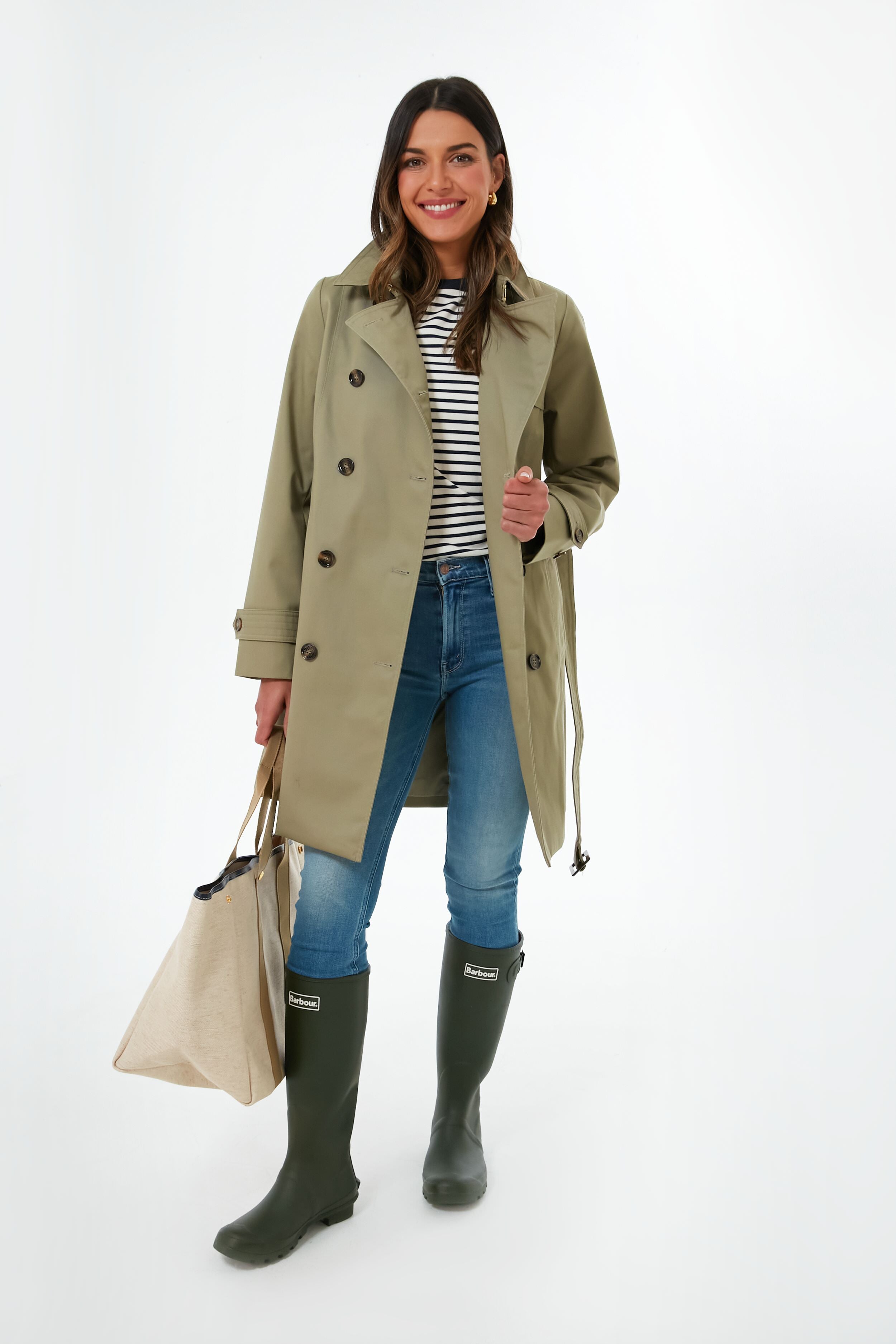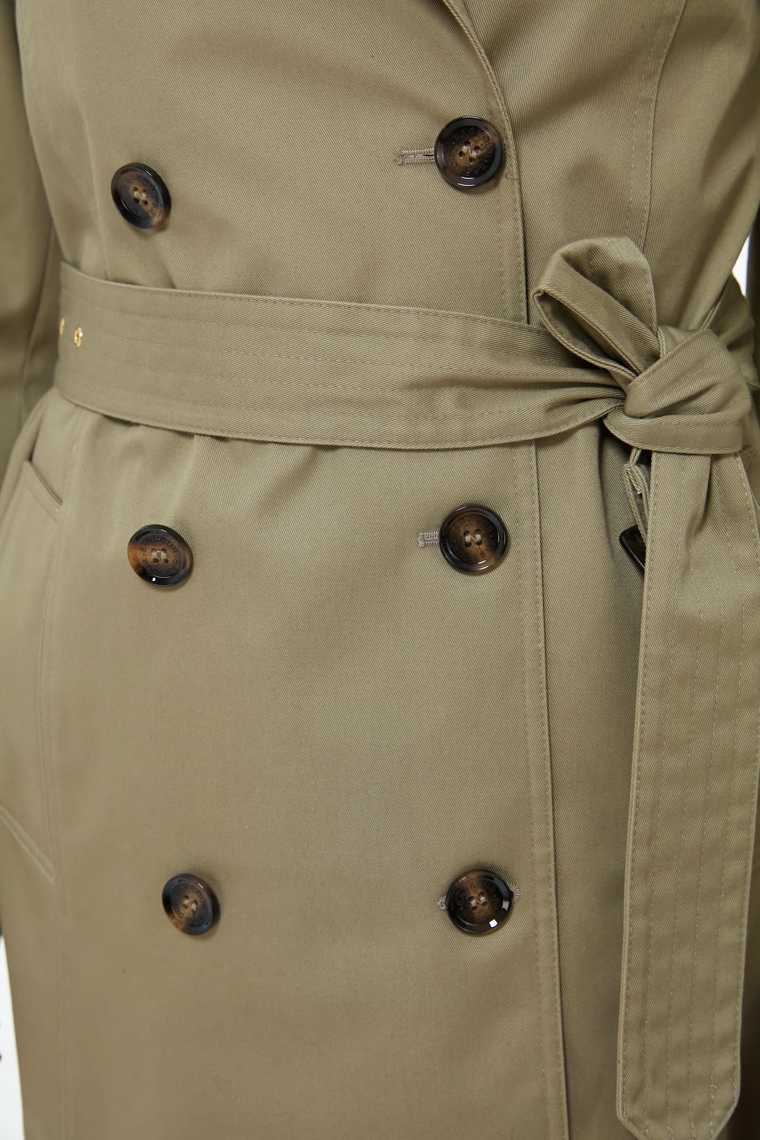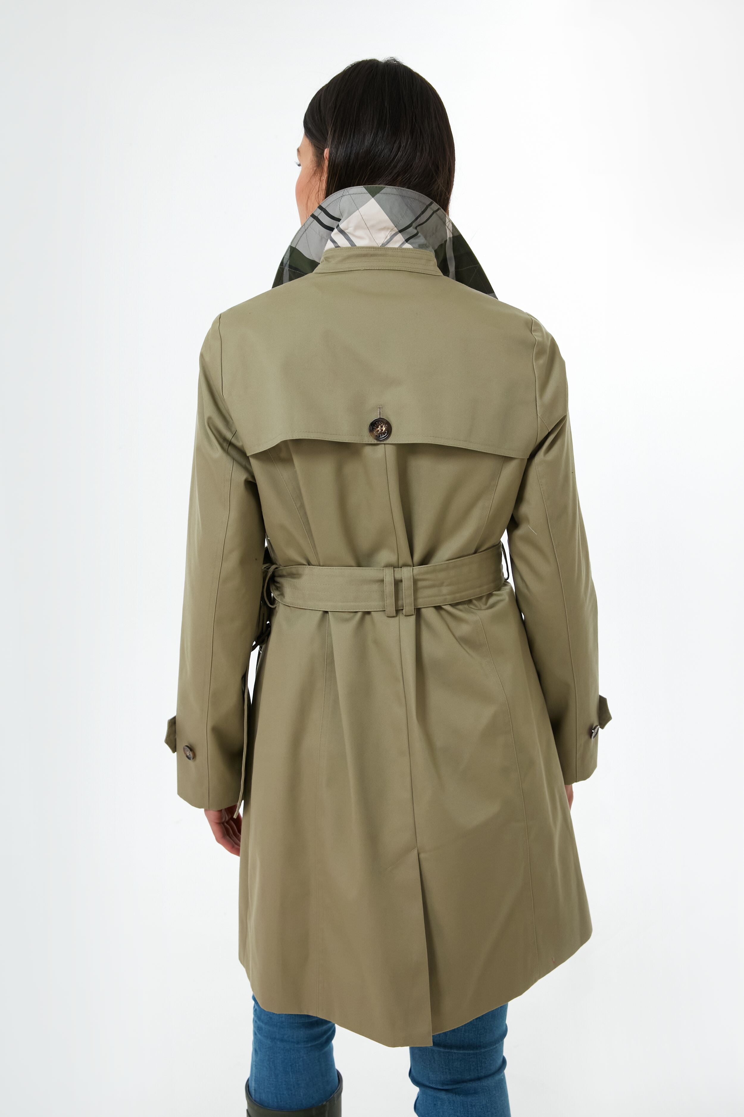 The Poplar Green Short Greta Showerproof exudes timelessness and a transitional. spring-y disposition. A classic trench silhouette updated with a modern shorter length. this style features a lapel collar. double-breasted imitation horn buttons. and a self-tie belt to create a perfect fit. Stay warm and dry on the greyest of days in this lovely jacket. and pair it with denim. boots. and a tote for a complete look.