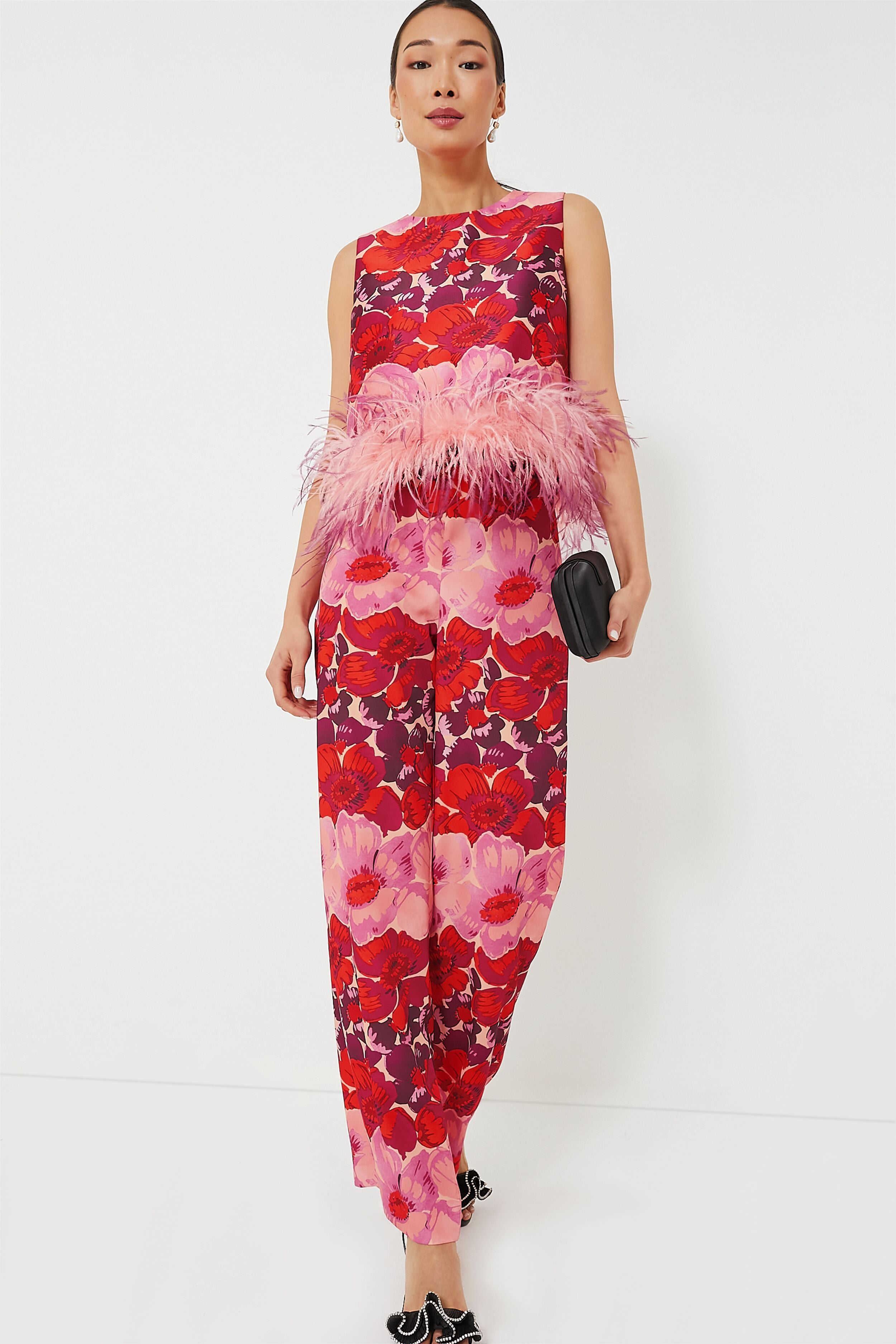 The party doesn't start until you walk in — wearing the Poppy Stripe Sabrina Blouse. Adorned with a breathtaking and brightly hued print. and finished with luxe feathers at the hem that bring an extra pop of fun. this effortless yet elevated silhouette is a must-have for any occasion on your social calendar. Pair it with the matching Erin Pants for a maximalist look sure to turn some heads. or with a mini skirt and heels for a flirty feel.