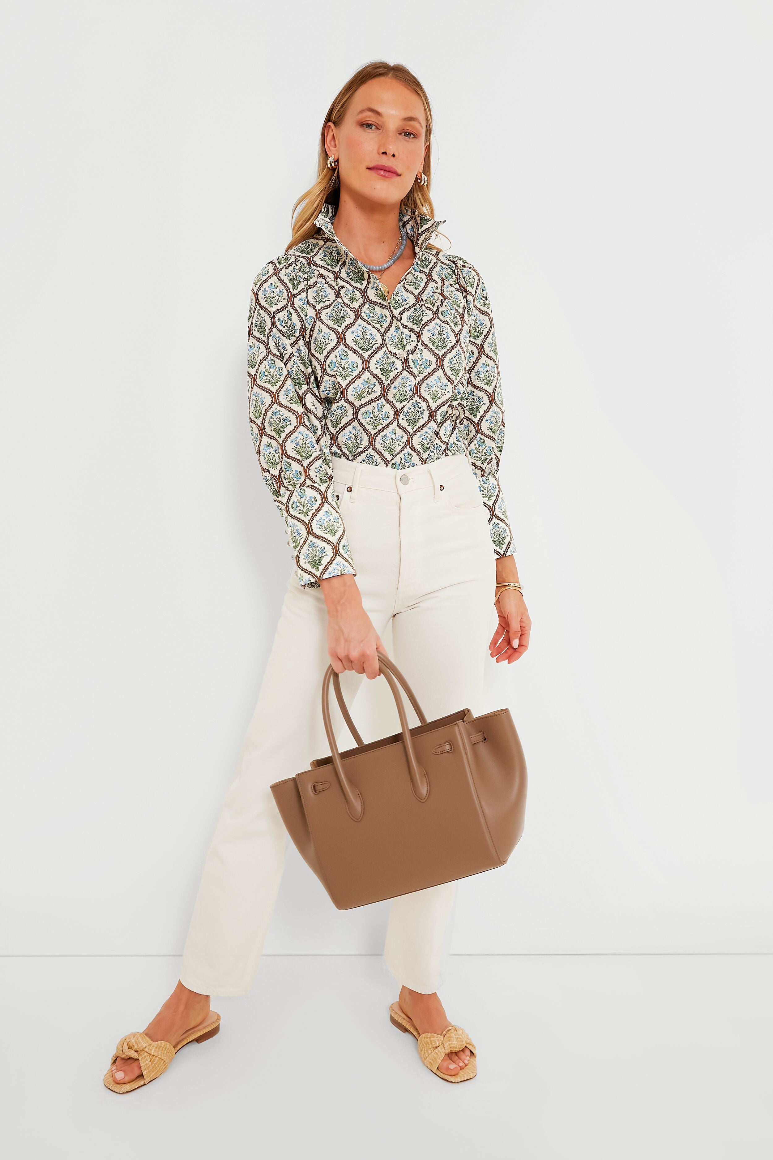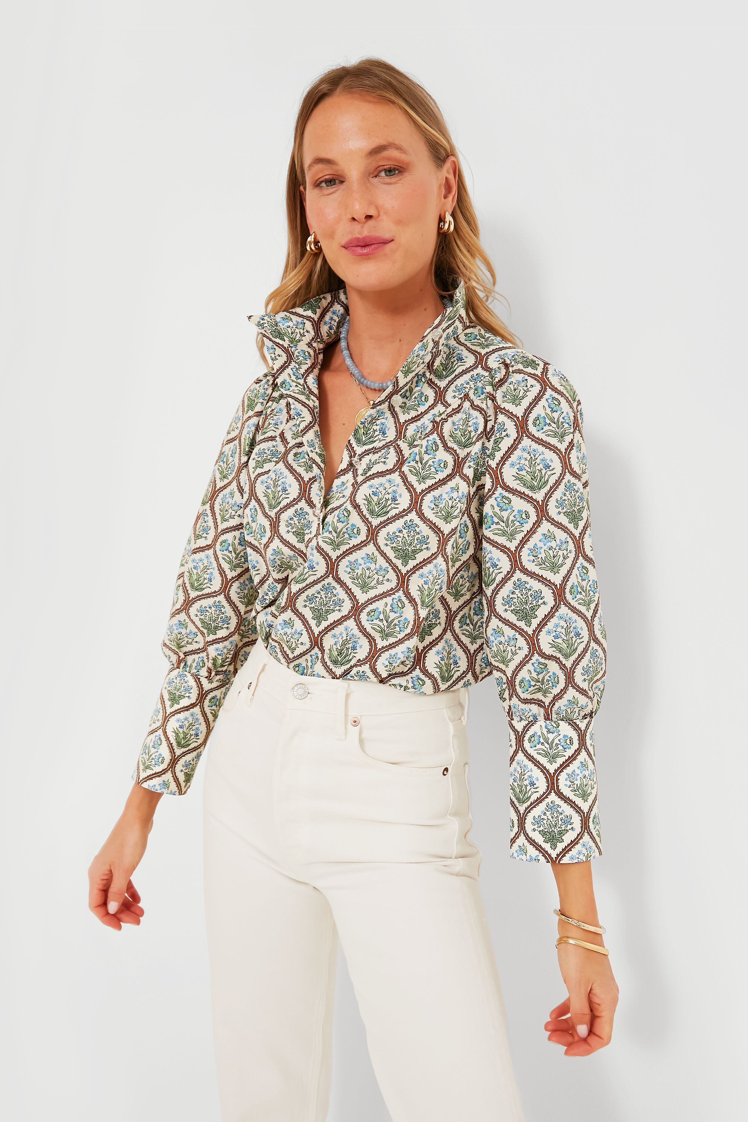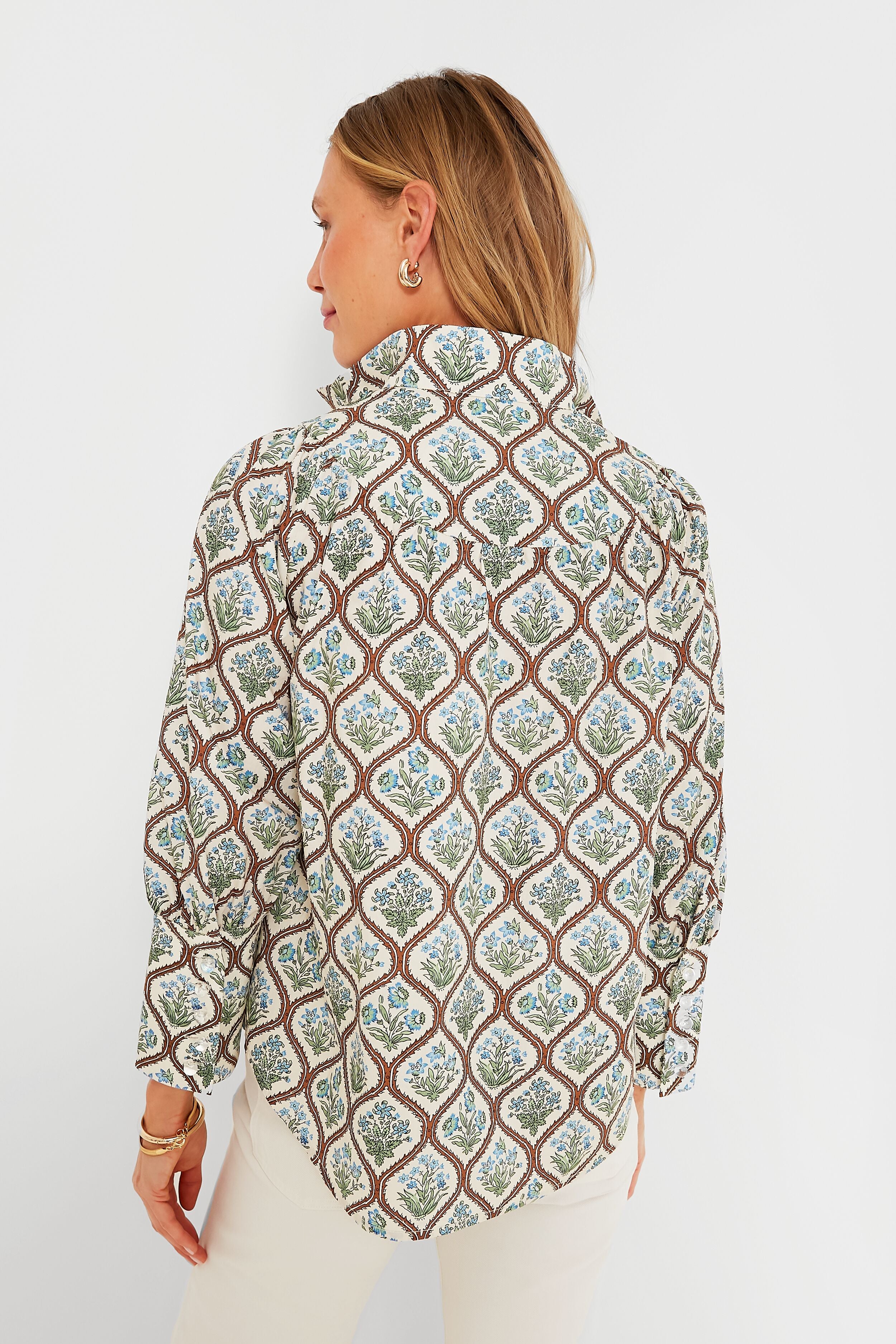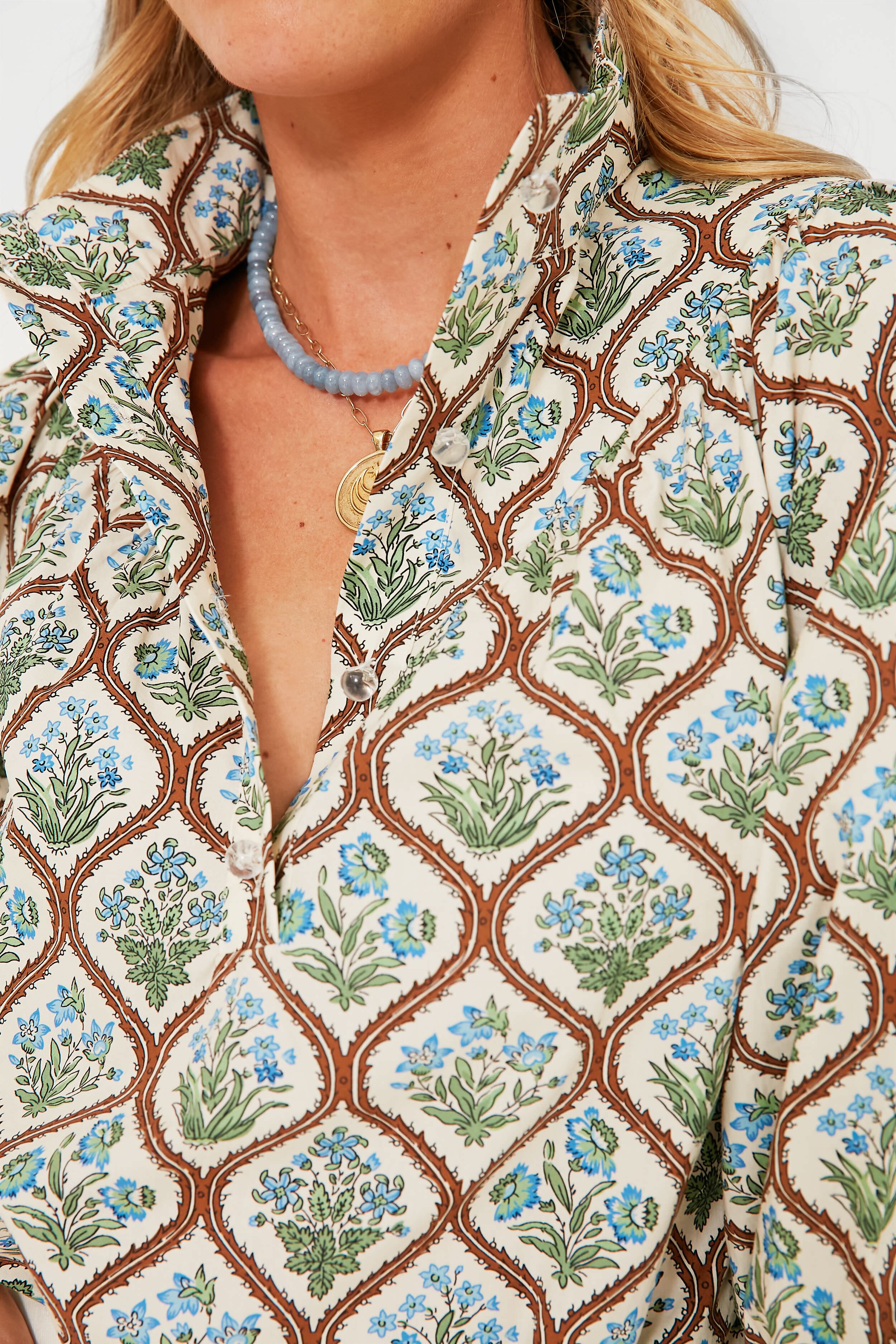 The Porcelain Bouquet Corrigan Blouse is decorated in blue and cognac botanical motifs upon a creamy backdrop for the perfect warm weather refresh. This updated classic features a stand collar with a three-quarter length button front placket and long cuffed sleeves for a chic. modern look. We love wearing this for an easy desk to drinks look. swapping from flats to heels and adding gold accessories for a dash of subtle glam.