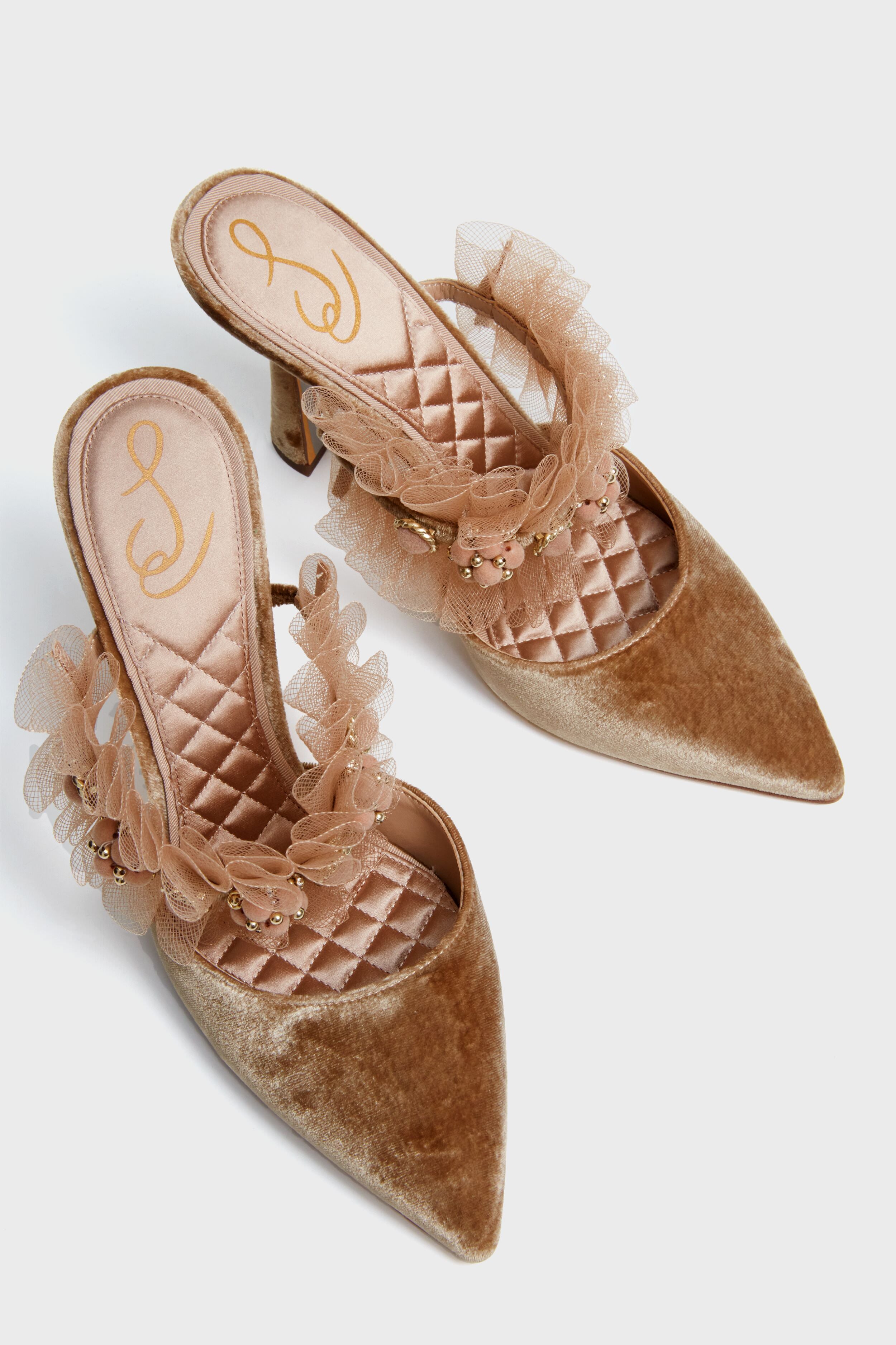 Steal the spotlight in the Prosecco Hughes Heels. featuring fun tulle textures and sparkling details. Whether you're attending a cocktail party. a wedding. or a special dinner. these heeled mules will elevate your style effortlessly. Pair them with a cocktail dress for a glamorous look or pair them with ankle-length jeans for a sophisticated yet comfortable choice.