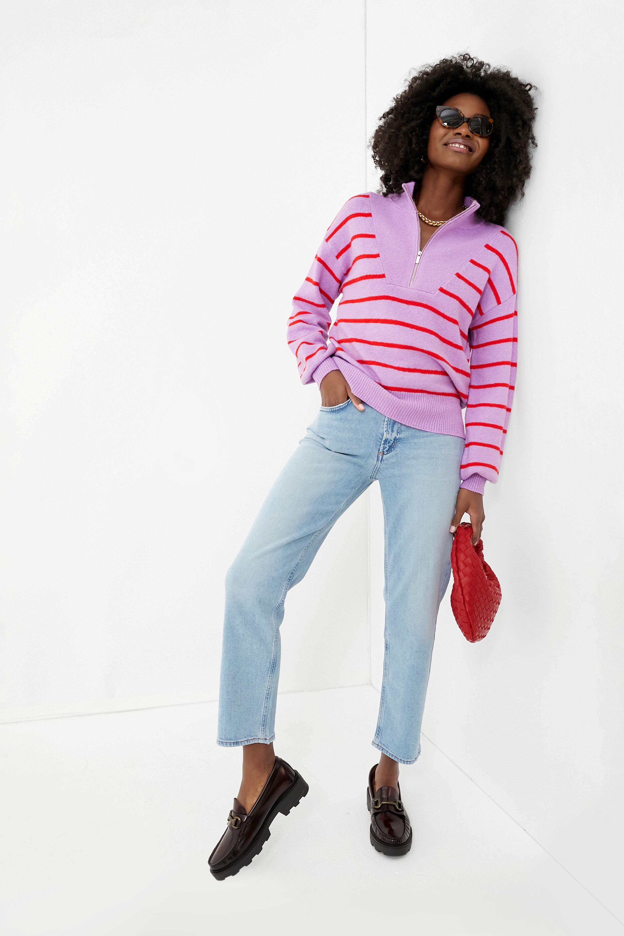 Get in line. The Purple Striped Quarter Zip takes the classic nautical vibes we know and love. and gives them a fresh update with bright hues! Complete with a mock neckline. a zippered front placket. and a cozy relaxed fit. you're sure to love this soft sweater for all seasons — pair it with leggings and boots. shorts and sandals. denim and a tote. or over your shoulders with a dress.