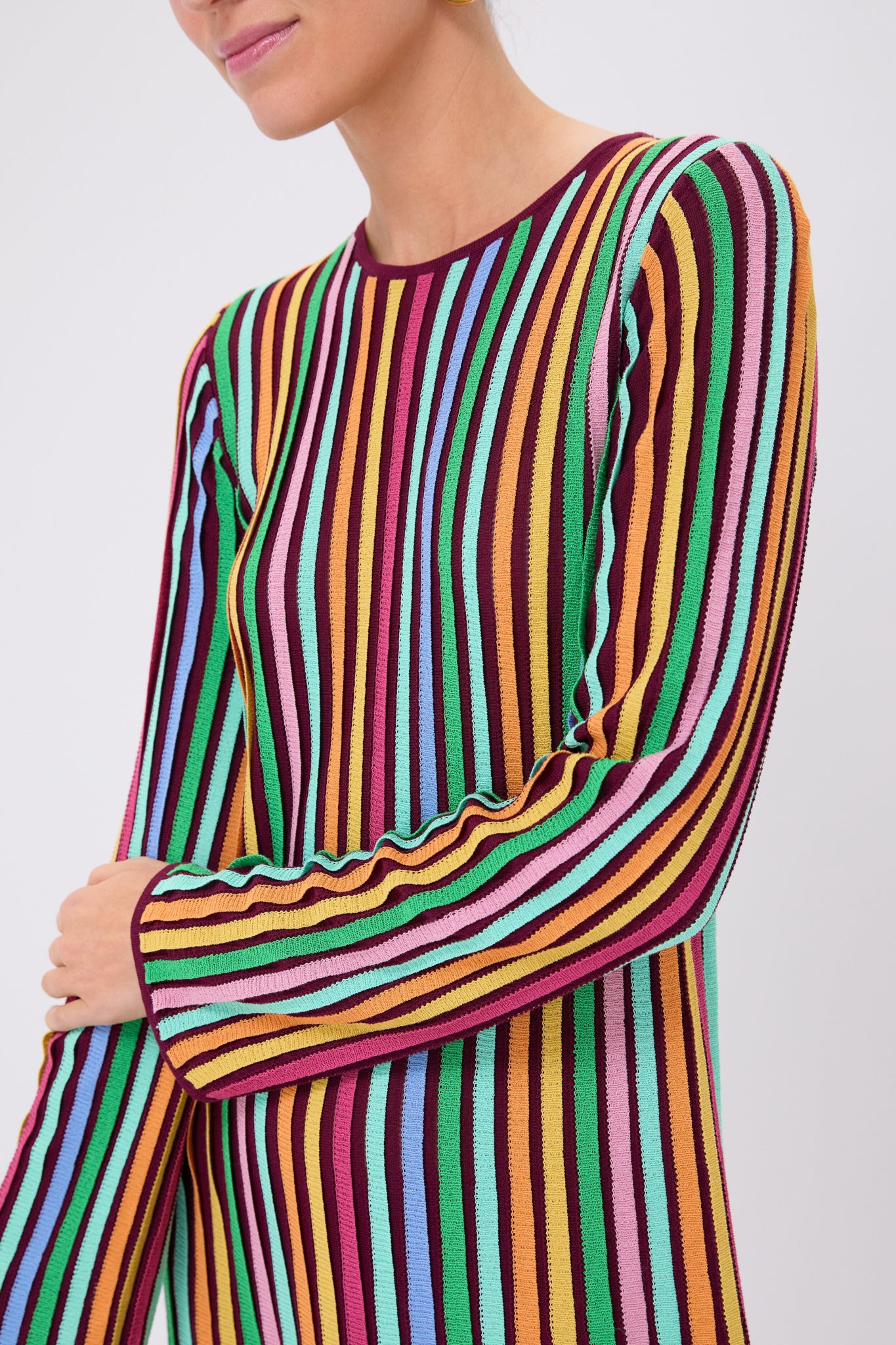 The Rainbow Stripe Knit Amal Dress is exactly what your closet needs. A perfect not-too-dressy-not-too-casual piece. this fit and flare mini is suited for lunch dates. lowkey events. and whenever you want a pop of fun in your outfit rotation. Featuring ultra-wearable touches like a round neckline. long sleeves that get wider at the cuff. and a unique ribbed row texture. you'll be styling this knit number with boots. flats. and kitten heels all year long!
